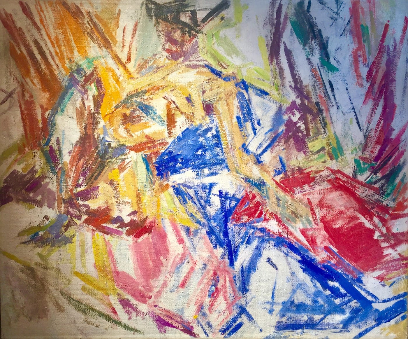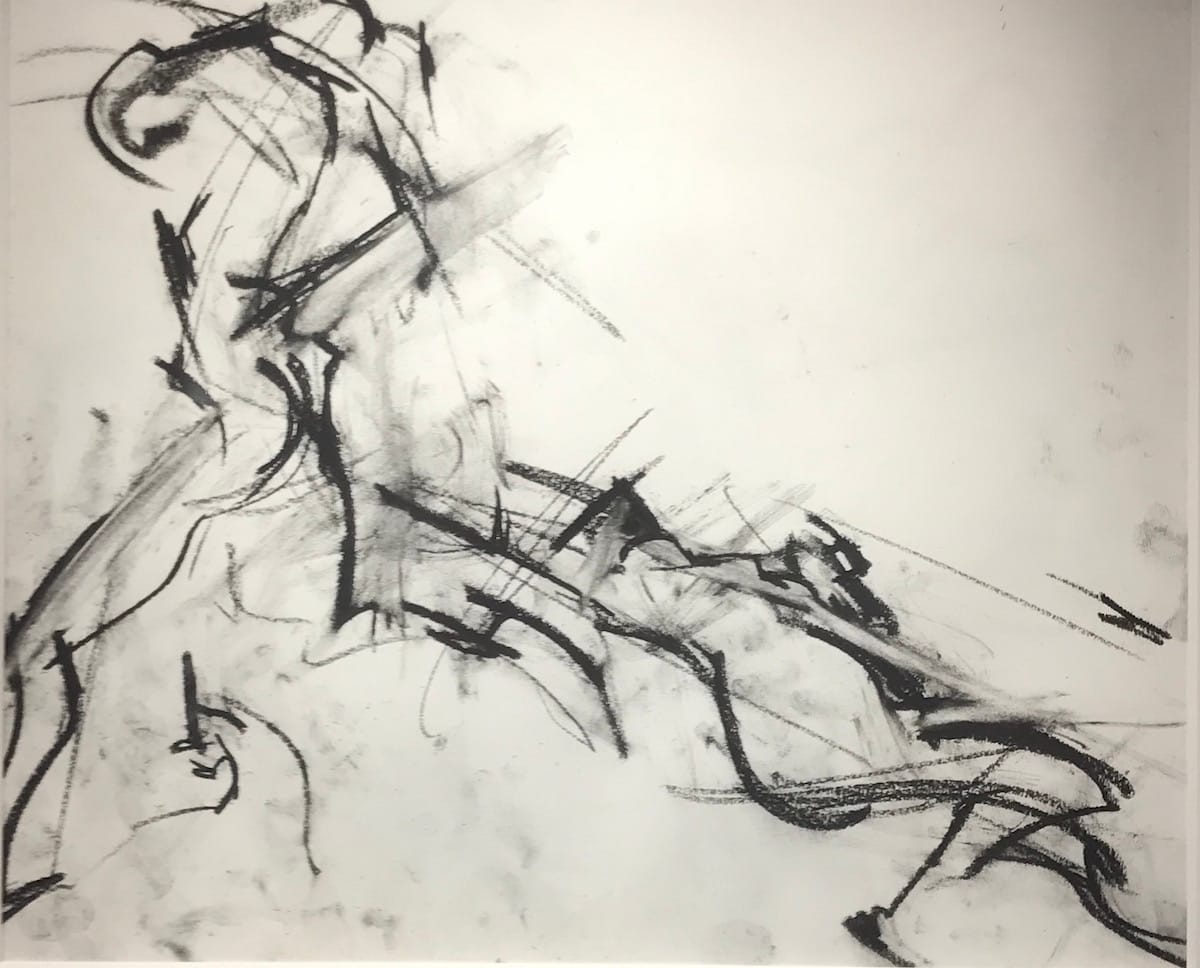 Instead, she made easel-size paintings (and charcoal on canvas drawings) based on the still life and the figure, but abstracted into a force field of compressed space with an agitated line. Her work was about capturing the electric energy between objects. Source imagery was rendered nearly unrecognizable. It was a painterly language and drawing style entirely her own.