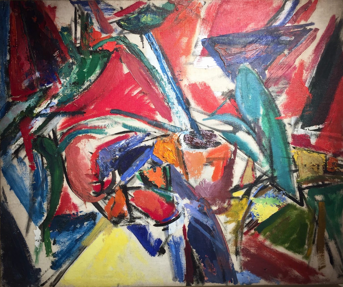 “Tabletop Still Life” (c. 1938), and “Table Still Life (version 1)” (c. 1941-43), however, show Matter beginning to find her own voice and painterly signature. She uses a strong, angular line within and between forms, turning the white, unpainted space of the canvas into an integral component. In the later work — painted during the war years and possibly an aesthetic response to the turmoil — she also starts to explode form. We can decipher the potted plant at the center of these paintings, while the remainder of the surface is a fiery trail of red, blue, and green triangles.