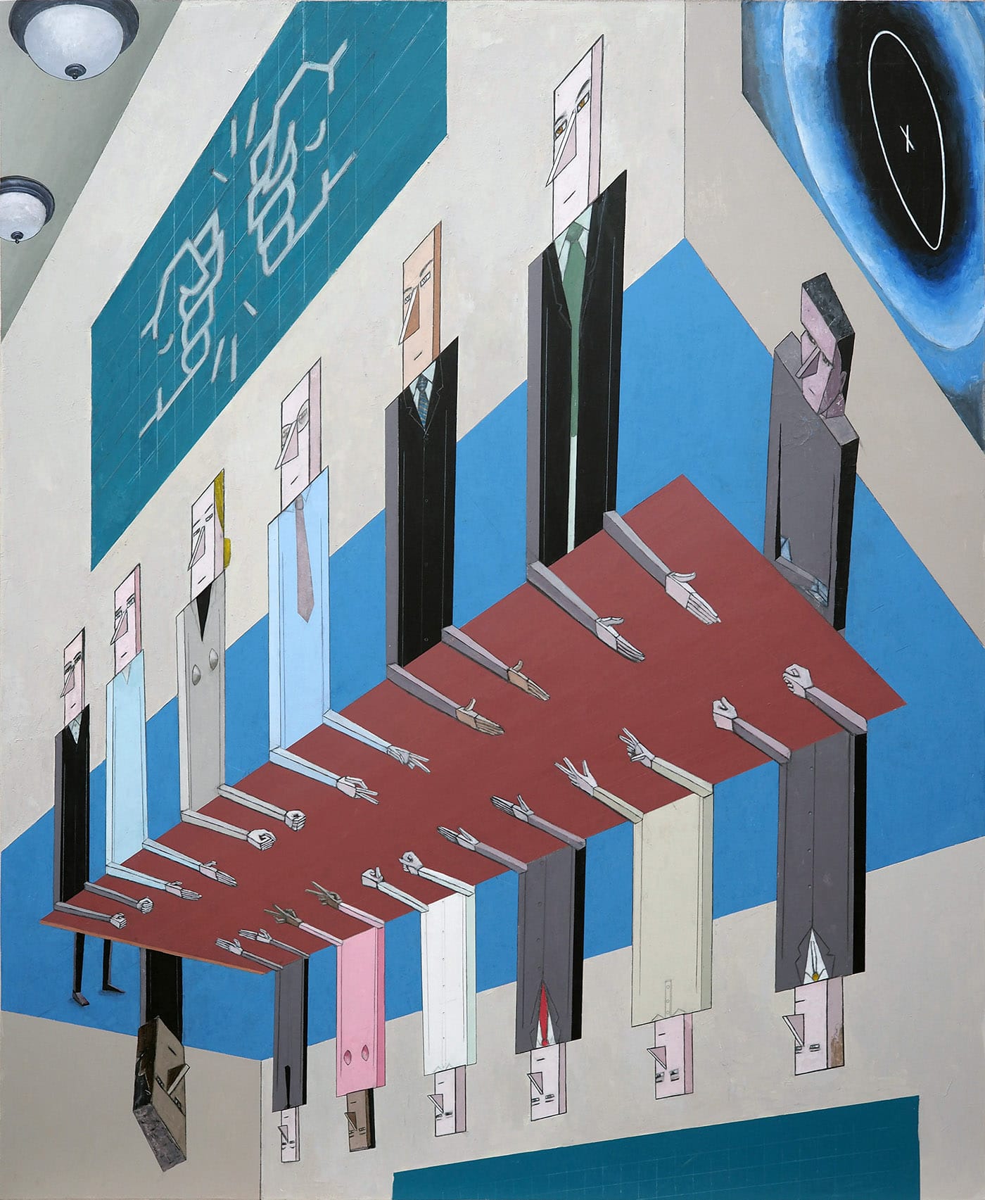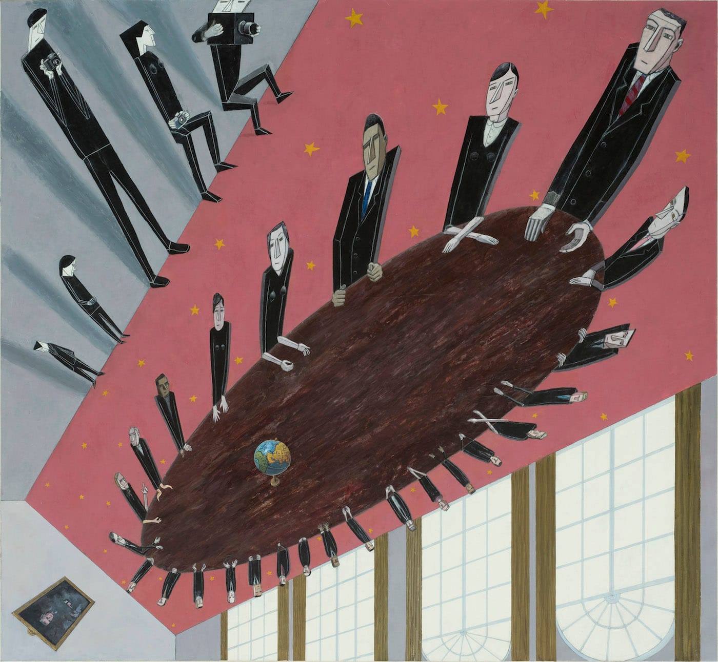 Punctuated by stars, the brownish-magenta wall-to-wall carpet of “Cabinet Meeting” (2017) extends at a diagonal from the top right corner toward the lower left, but stops short of touching the edges of the canvas, diminishing in size as well as tilting away from the picture plane as it travels downward. The powerful thrust of the diagonal carpet infuses the room with a vertiginous perspective. The floor is literally and figuratively dropping away from us.