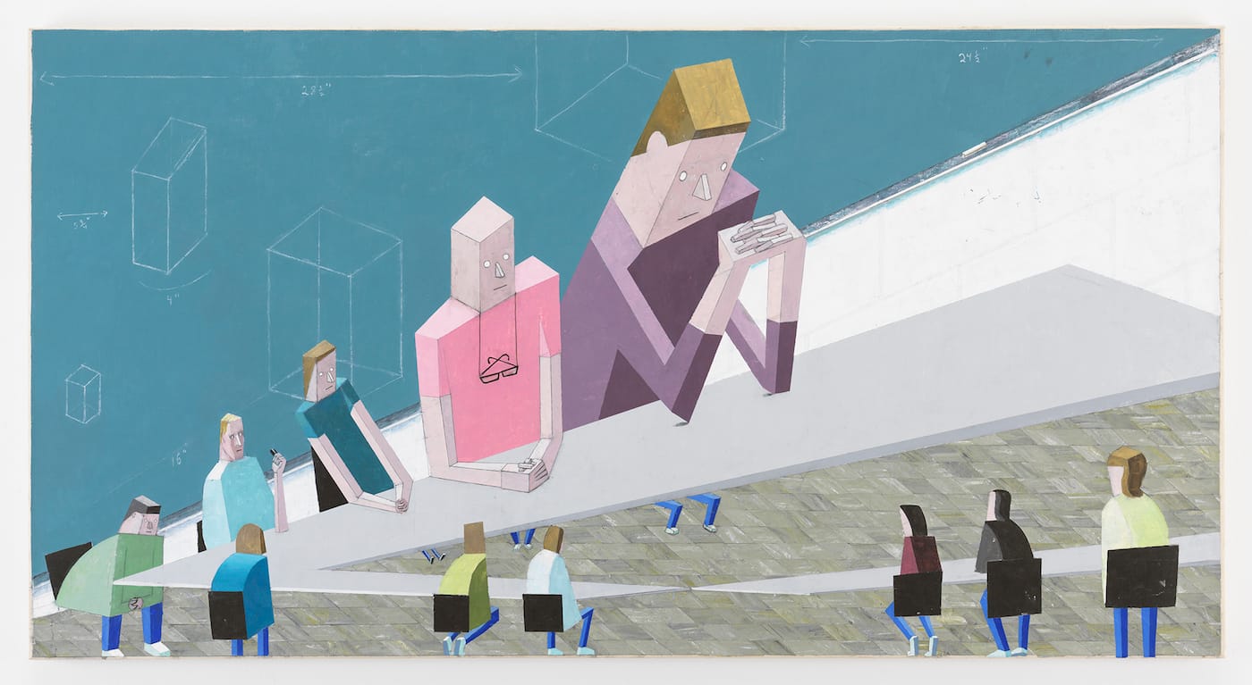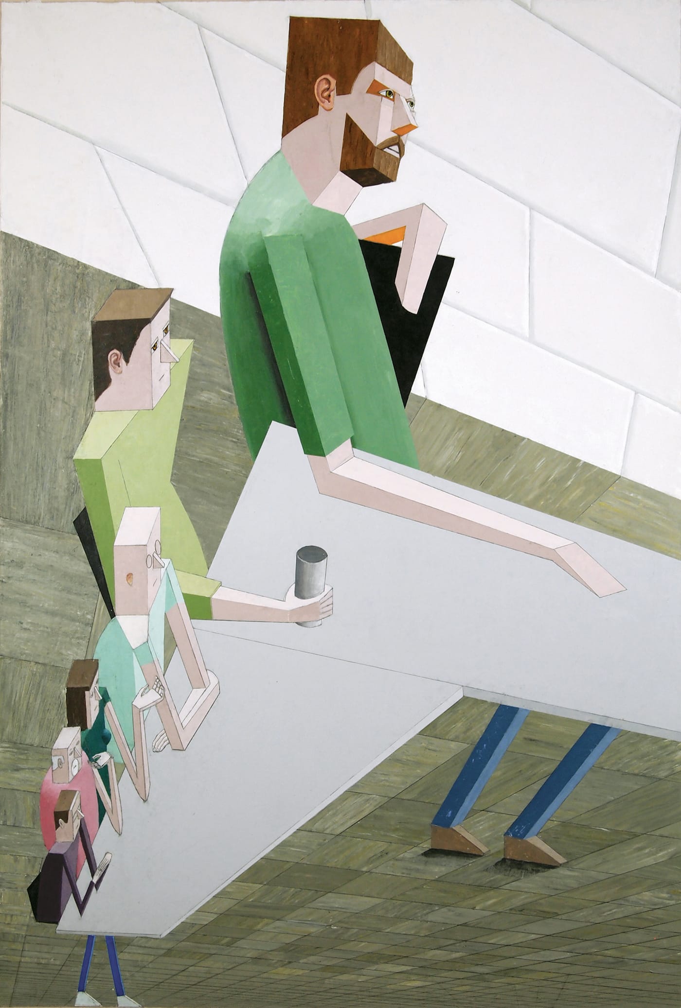 There are a handful of constants in Larsen’s work. The first is the use of reverse perspective, in which things that are farther away appear larger than things that are closer. The second is that all the figures are transformed into geometric forms, so that every part of the body is treated as a distinct entity, each seemingly carved from wood. Heads are depicted as block-like forms with faces depicted on one side, while noses are rendered as sharp triangular planes jutting out from the face. The third is that Larsen pictorially manipulates the body as if it were a sectioned puppet, with every part capable of performing action that ostensibly conforms to its geometric structure. Within this schema, when a back is curved, the figure’s posture becomes extraordinary in its ordinariness. Working under these extreme self-imposed restraints, Larsen focuses attention on a wide range of banal human gestures.
