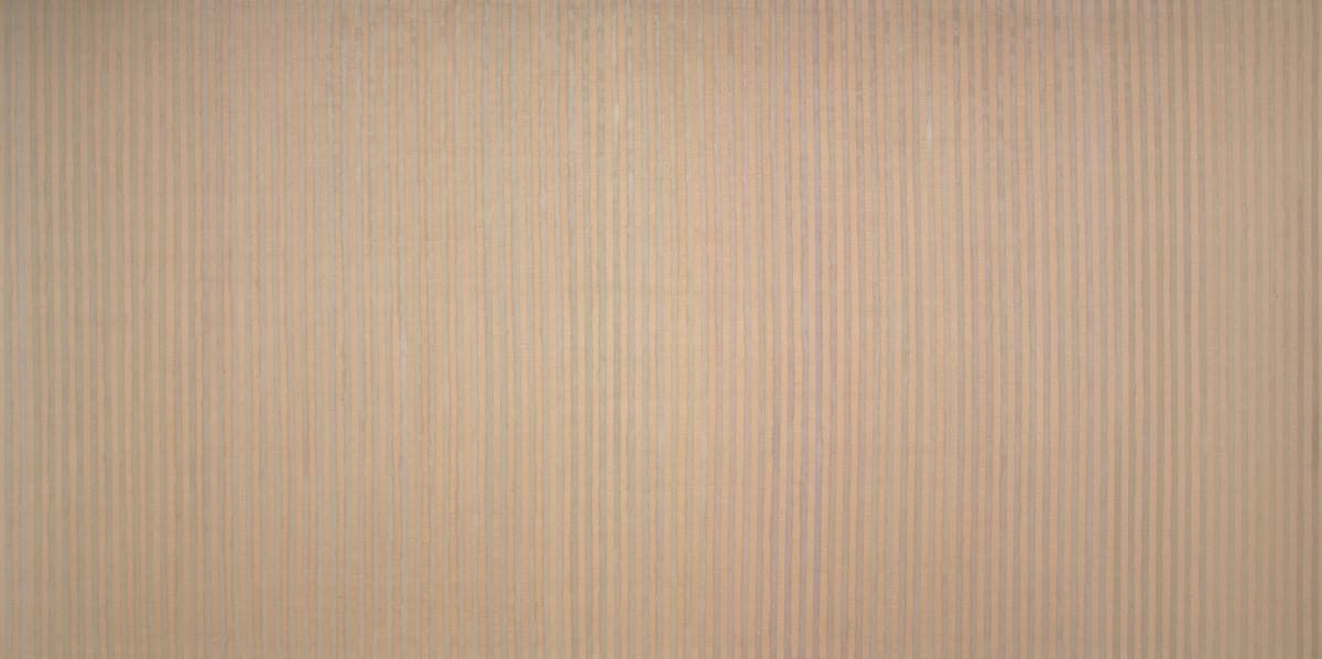 One of the more beguiling aspects of the painting is that the stripes appear to be layered, with a primary coat of Mars red or some other warm, earthy color beneath the gray, but close attention reveals that the reddish tones gracing the edges of the stripes are dark bits of gray pigment clinging to the tooth of the canvas. I doubt that you will come across another painting anytime soon that is as simultaneously measured, stark, and ravishing.