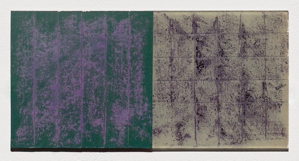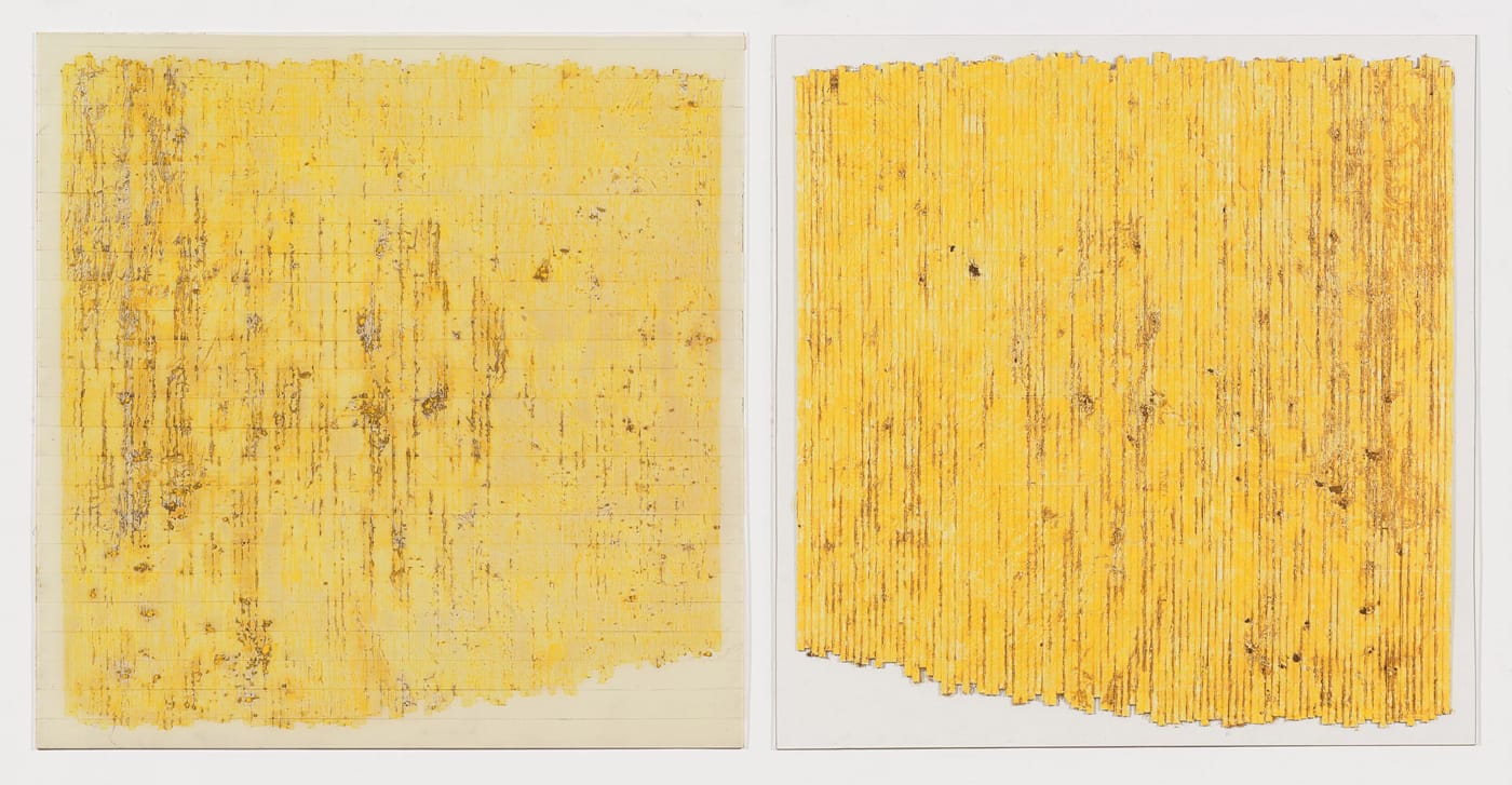 A ’78 untitled diptych in golden yellow is easily the juiciest piece in the show. The right half is oil pastel over narrow, vertical strips of what could be drafting tape, while the left is composed of broader bands of horizontally aligned tape facing us from the obverse side of the Plexiglas. The vertical striations on the right, which include unaccountable stains of brown, are transferred to the adhesive side of the tape on the left, but the original surface now bears slight traces of the left half’s horizontal edges: each iteration affects the other.