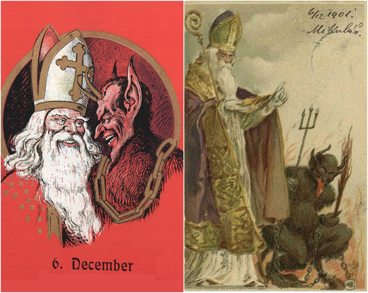 Krampuskarten depict Saint Nicholas's darker counterpart: the devilish Krampus, whose current image visually carries centuries of folklore.