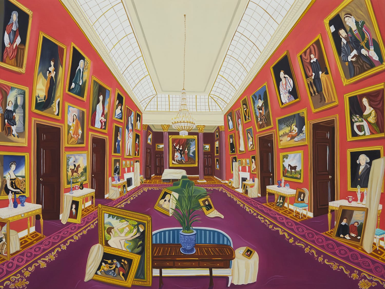 Scherer chose small museums, homes open to the public, and the annual summer show at the Royal Academy in London to paint, and in which to implicate the viewer’s presence. In “Sir John Soane’s Museum, Library, and Dining Room,” it is as if we are standing behind Soane’s askew desk, looking at an open notebook with his writing, along with watercolor sketches and books scattered across the desk’s surface. Directly ahead we see a large window that frames another room whose pale, striped blue walls are full of paintings, most of them portraits. Several smaller paintings are clustered around the largest, most coloristically dominant portrait, depicting a man dressed in black seated in a large red chair. That red, which marks the furthest spot from the viewer, is placed in the center of the composition. While Scherer uses red sparingly elsewhere in the painting, her use of it here gives the highly detailed composition, full of distinct images and points of interest, a focal point from which one’s attention can wander, while also adding nuance and complexity to the content.