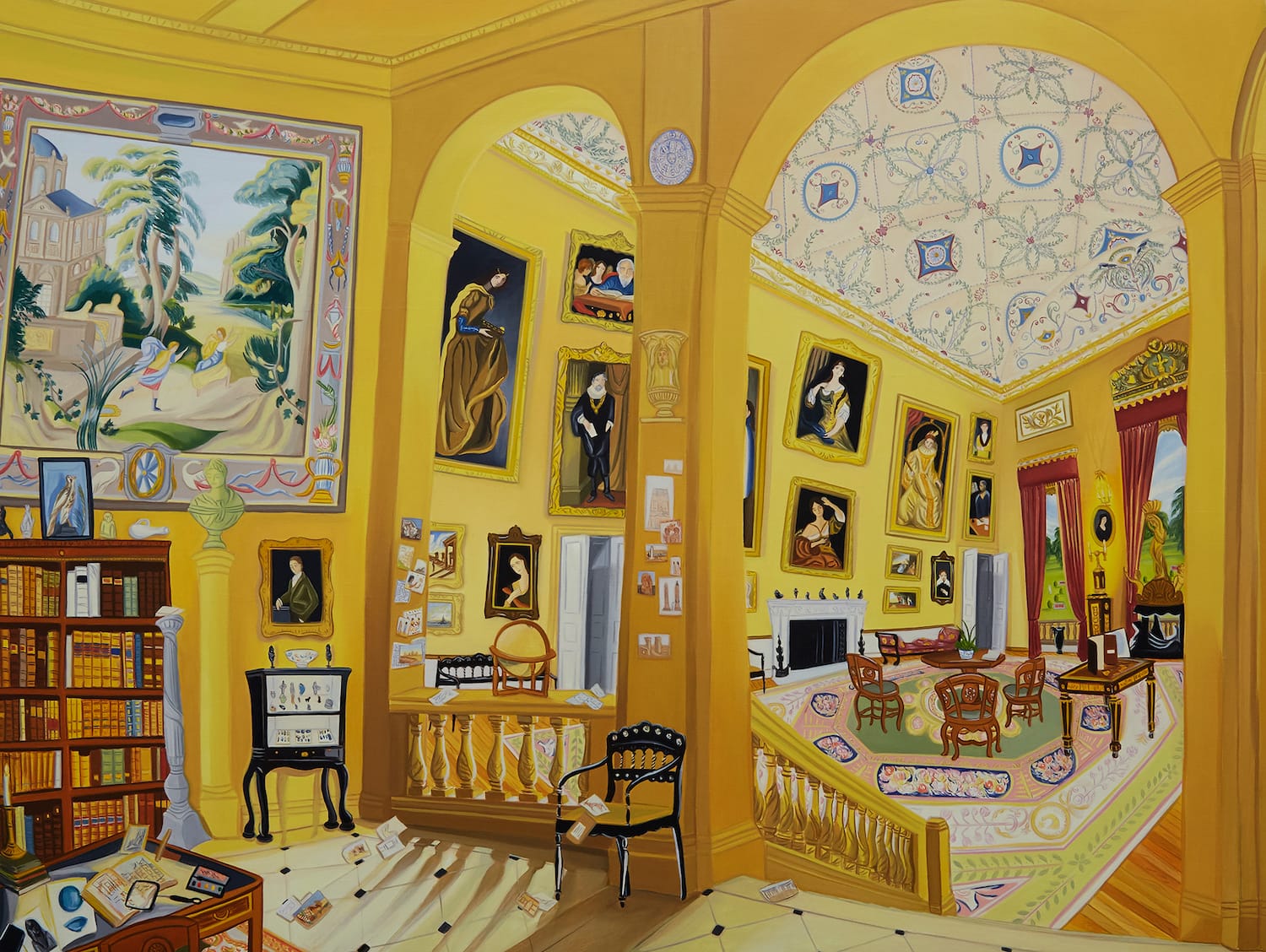 As with all the paintings in Scherer’s exhibition, this one is devoid of human presence. Things left behind suggest unfinished tasks. Are the works we see on the walls all by artists who became Royal Academicians? How many do you recognize? What is the difference between being famous and forgettable? Is art’s destiny to become an artifact left behind, something that does not speak to us, at least in any way that might hold our attention for very long? Is it meant to be a distraction, something to stand in front of for a selfie, today’s way of saying “’I was there”? Scherer seems to be interested in what happens after we are no longer here and are unable to control anything in this world. Her insurgent nature, full of humor and devotion to detail, is a wonderful antidote in these disheartening times.