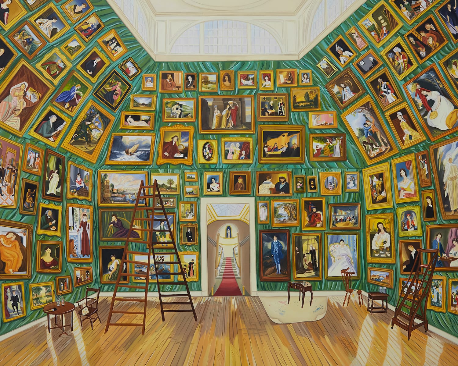 There are deeper truths than the literal ones that Kosuth and Bochner arrived at, and that is what Scherer is after. This becomes evident in “The Royal Academy Summer Exhibition 1769-1915” (2021-22), in which Scherer depicts a room with paintings displayed salon style from floor to ceiling on three green walls. (According to a catalogue I found online, it is one of many galleries in the Royal Academy used for the exhibition.) We are standing at the far end of this room. Directly ahead is a hall and red-carpeted stairs. To the left of the doorway is an open stepladder, along with a small round table, on which paintbrushes have been left. A paint palette has been left on a nearby chair. These and other details hints that the works in the exhibition need some touching up and minor restoration, because art is not impervious to time or the environment.