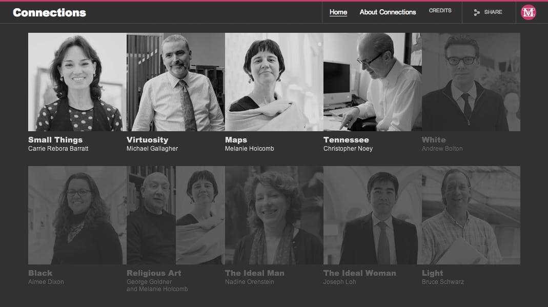 Collected in a nice interactive grid, the Met’s “Connections” splash page gives us a nice list of things to choose from. So far, we have “Small Things”, “Virtuosity”, “Maps” and “Tennessee” with “White” coming out January 11. A nice black and white portait of the lecturing staff member acts as a thumbnail for their presentation. The slideshows themselves take on the same format, audio voiceover with periodic slides of objects from the Met’s collection, but each is also entirely unique. The personality of the staff really shines through in the objects they pick and the way they talk about them (Dear Melanie Holcomb, let’s be friends).
