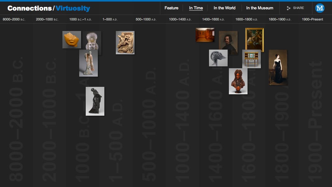 “Connections” slideshows come with awesome charts detailing the featured objects in a time line, on a world map and according to where they’re on display in the museum. The streaming progress bar also features dots that are helpful in skipping between objects within the individual videos.