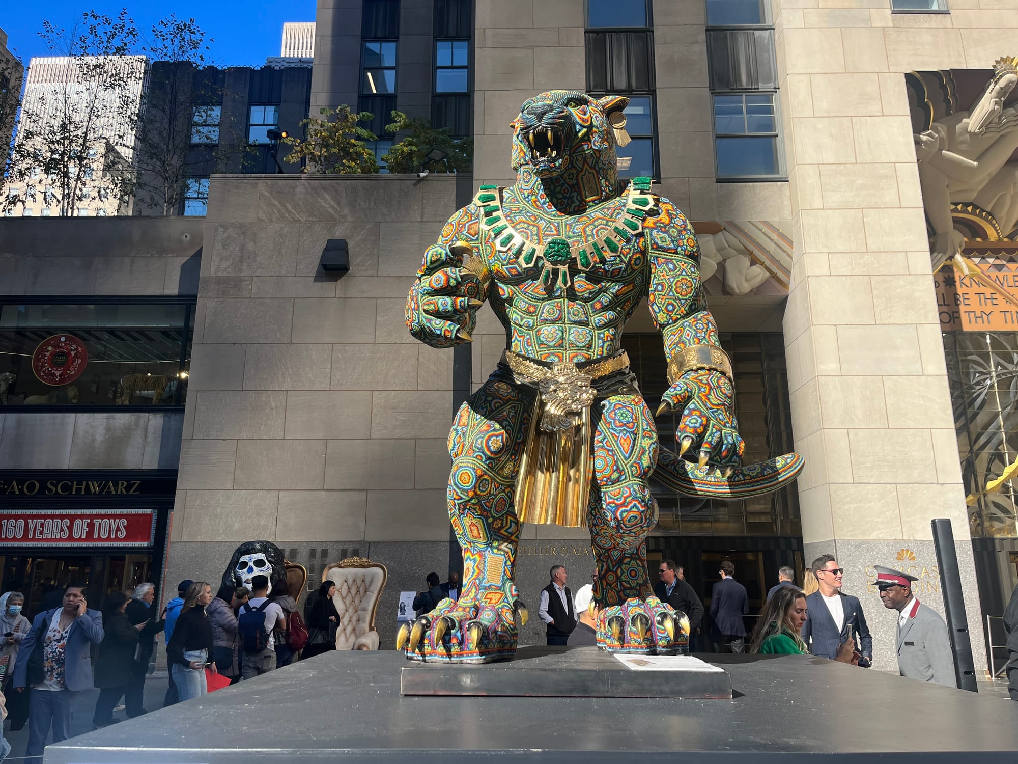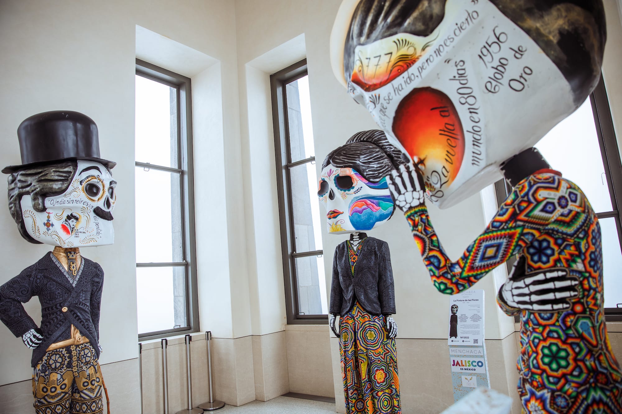 A dozen catrinas designed by Cesar Menchaca, an artist whose studio employs Huichol artisans and whose work makes use of intricate crystal beads, are placed at various locations around the plaza and the Top of the Rock, the observation deck on top of Rockefeller Center.