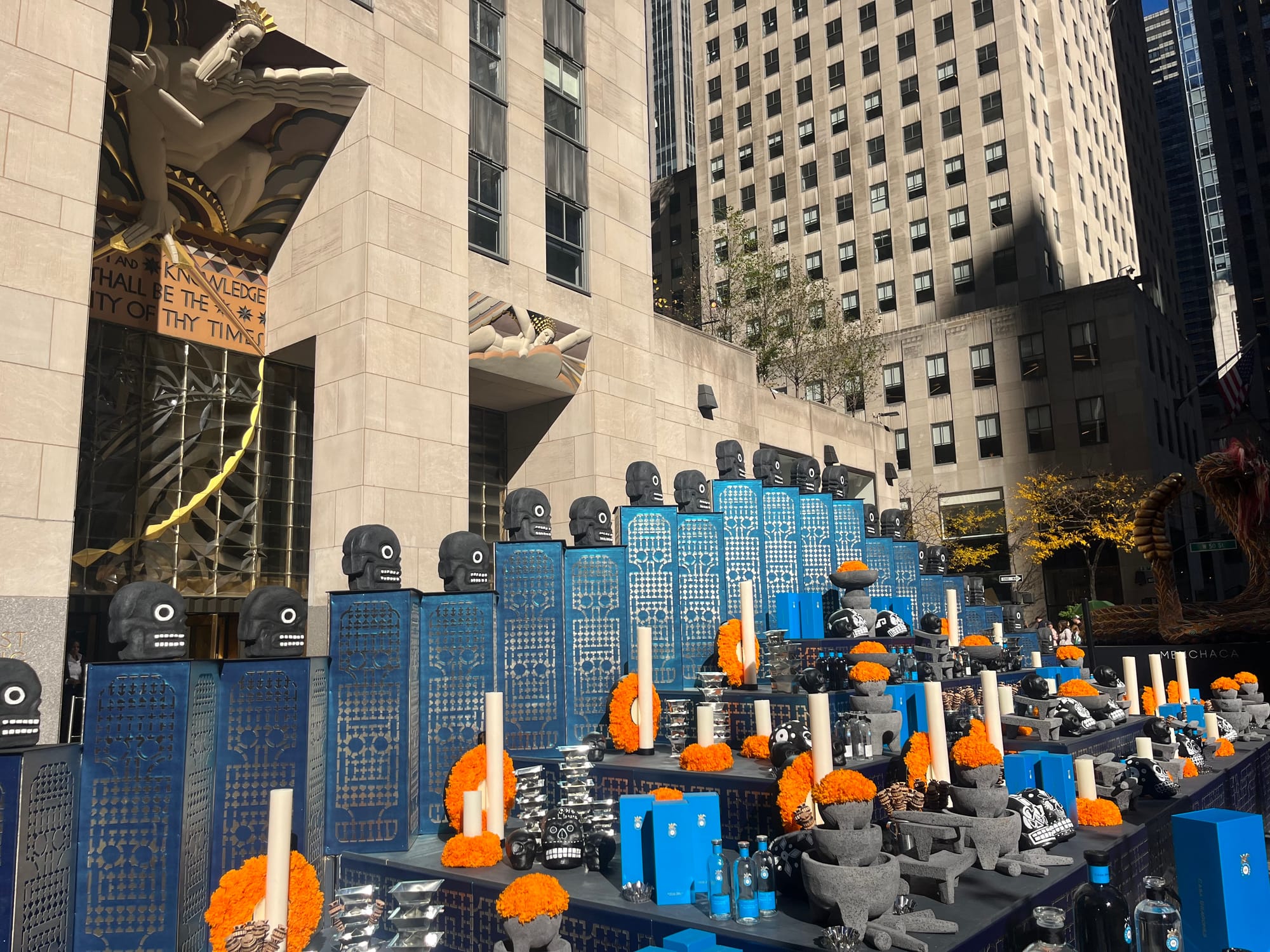 Carefully arranged bouquets of brightly orange marigold flowers — a hallmark of the holiday representing the impermanence of life — dapple the ofrenda, an altar constructed to honor the memory of loved ones, set up in front of 30 Rock. Alongside the flowers are abstract charcoal-gray skulls, candles, and offerings of tequila. This year, the ofrenda is dedicated to modern Mexican sculptors, particularly those explored in contemporary artist Pedro Reyes’s book MONUMENTAL: The Public Dimension of Sculpture 1927-1979.