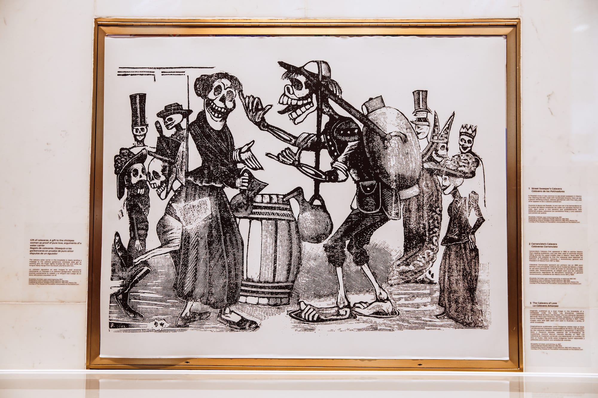 Prints by Posada are also on show in the lobby of 10 Rockefeller Plaza, commemorating the 170th anniversary of the artist's birth. Over the course of his career and life, Posada, a political cartoonist and lithographer born in 1852, worked at several newspapers and publishing imprints, creatively documenting contemporary political events, the failures of government, and the plight of the people. Posada's signature was to portray people using skulls and skeletons, popularizing that imagery and their association with Mexican nationhood and heritage.