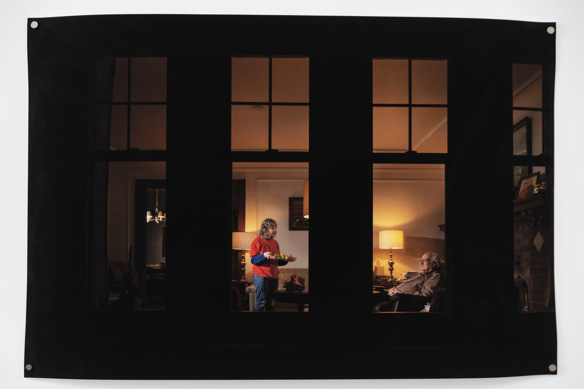 Bielefeld shares Bauer’s fascination with familial collections by pairing Bibles, clocks, and other tchotchkes with their collectors: her mother and father. Part of her larger series To Commit To Memory, each image restages quiet interactions in her parents’ evangelical home: folding laundry, serving dinner, and memorizing scripture. Bielefeld heightens the reality of these tableaus by including transcripts from her parents’ conversations, allowing her subjects a voice.