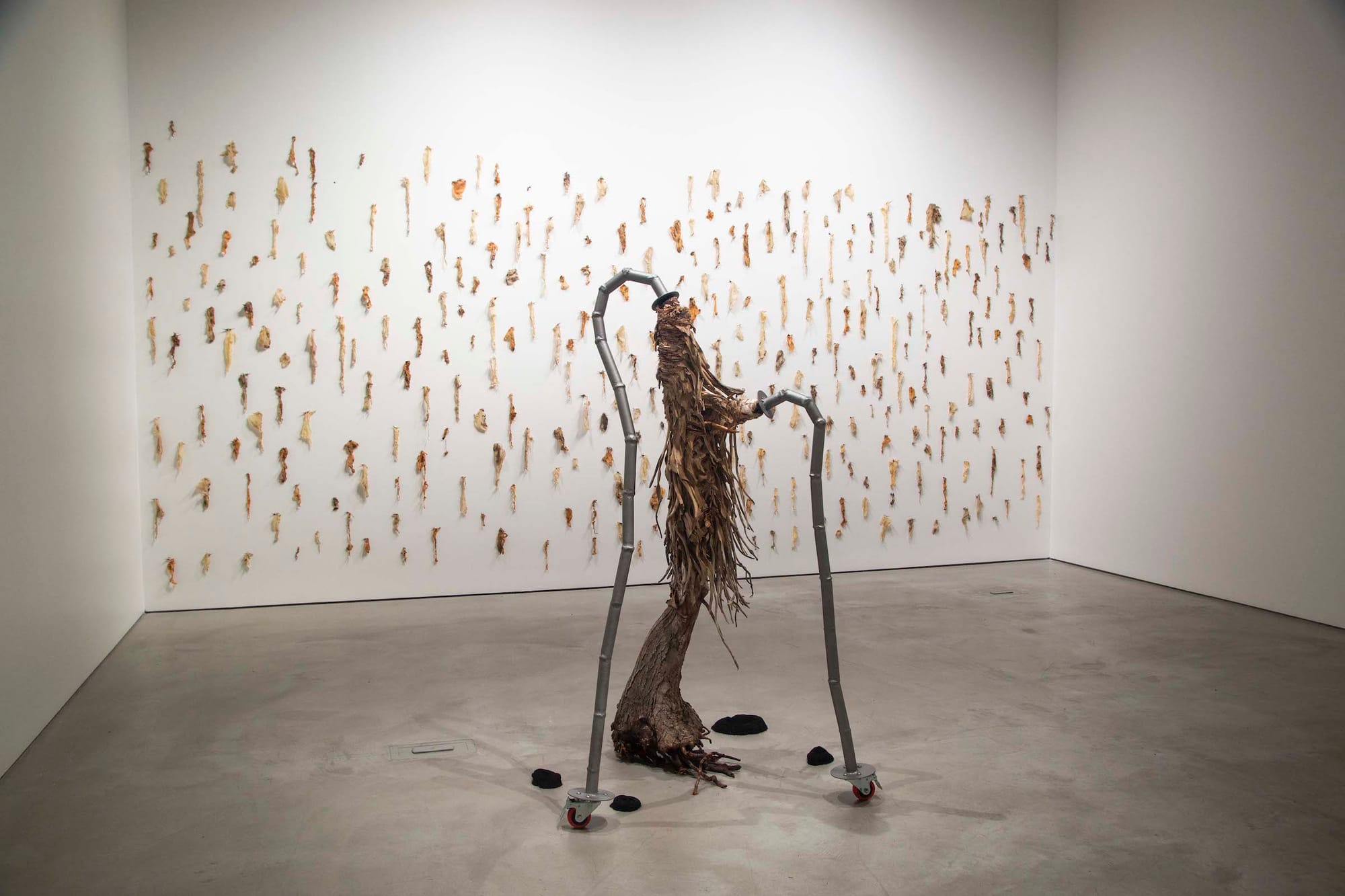 In contrast to the shared space for CalArts graduates, UCI MFAs have been afforded their own galleries in the dispersed arts center plaza on campus. In her contribution, “The Keeling,” Ivy Guild reanimates the dried husks of aloe collected from the now-demolished UCI Arboretum. Displaced from South Africa, this plant faced another forced removal. Guild designs support structures for each aloe corpse so that they appear ready to walk back to their distant soil home. Through latex casts (in “Sloughing”) and metal fixtures (in “Dizygotic” and “Rollator”), Guild gives these diasporic seedlings a dignity not yet afforded.