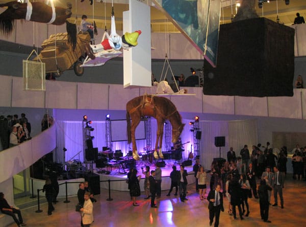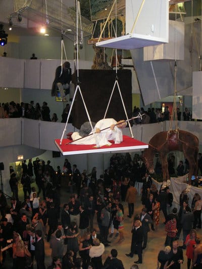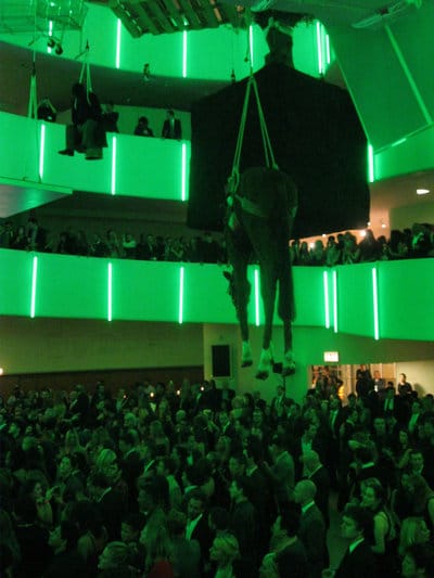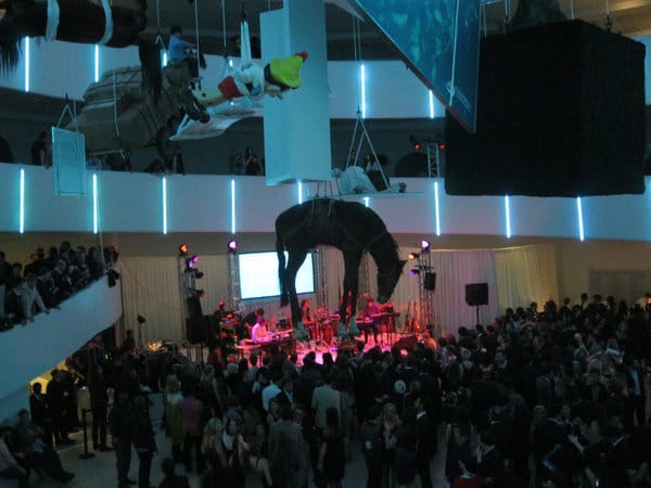 Hyperallergic rocks it in Williamsburg, Brooklyn, so naturally we felt compelled to review MGMT’s performance at the Guggenheim last night. The band, a staple of any Williamsburg playlist, performed in the rotunda of the museum as part of the 2011 Guggenheim International Gala to celebrate Italian artist Maurizio Cattelan’s blockbuster exhibition, All. The night was a glossy affair with art world insiders and rich board members and their entourages shmoozing and boozing under Cattelan’s epic sculpture web. As soon as I got to the party I had one question: where are all the hipsters at?