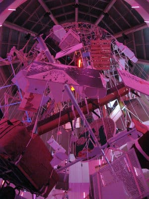As the band took to the stage, neon beams appeared all along the outer walls of the ramps, turning the cavernous heart of the Guggenheim into a fantastic light show. The Cattelan suddenly looked like a scene from a bad acid trip (or maybe an awesome one). Standing right beneath Cattelan’s Picasso sculpture with its creepy engorged head, I was completely transfixed by the flashing blue, green and pink lights ricocheting off the work. The light show was a perfect match for Cattelan’s bad boy installation that turns the pristine Guggenheim into something carnivalesque.
