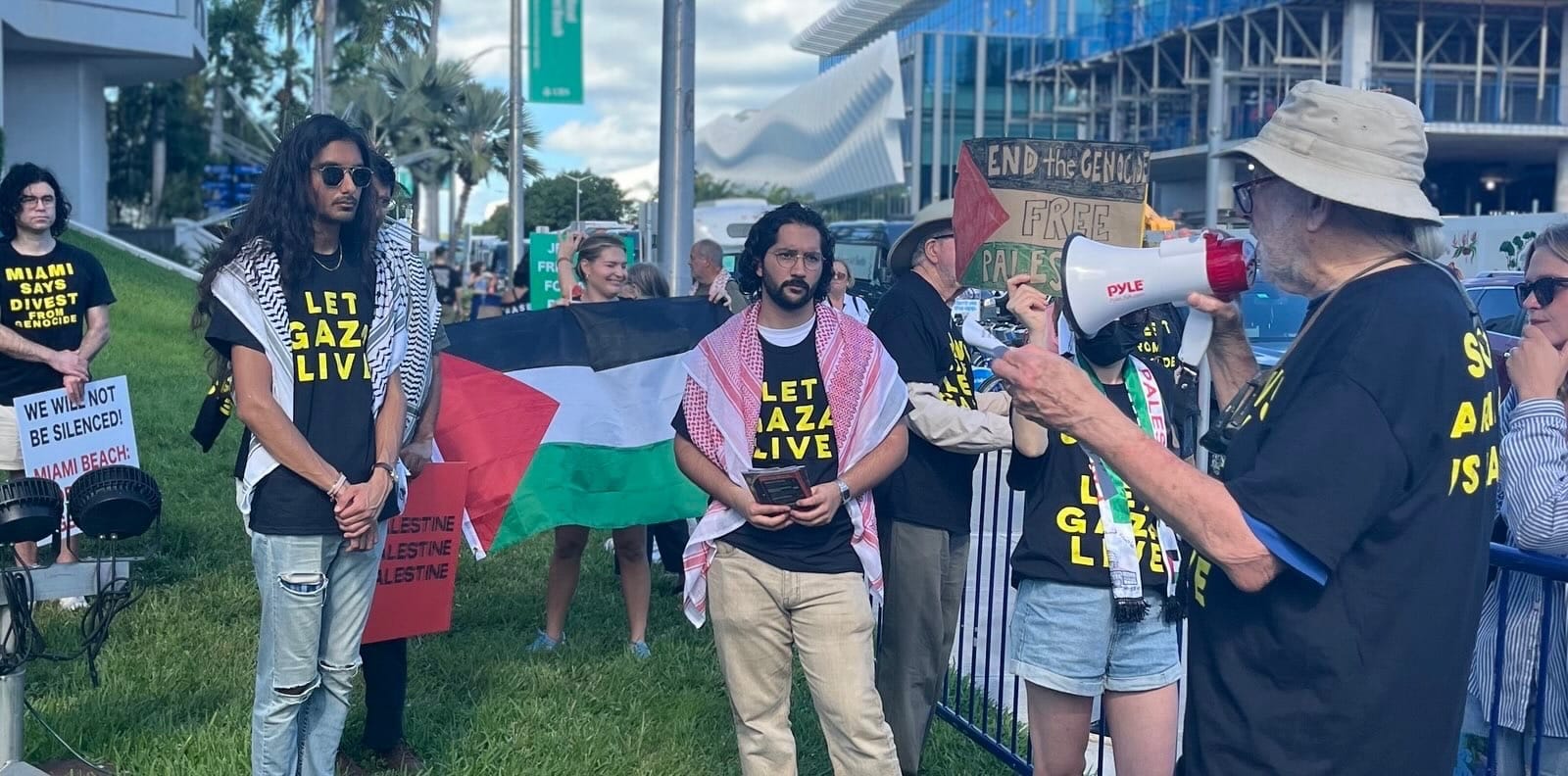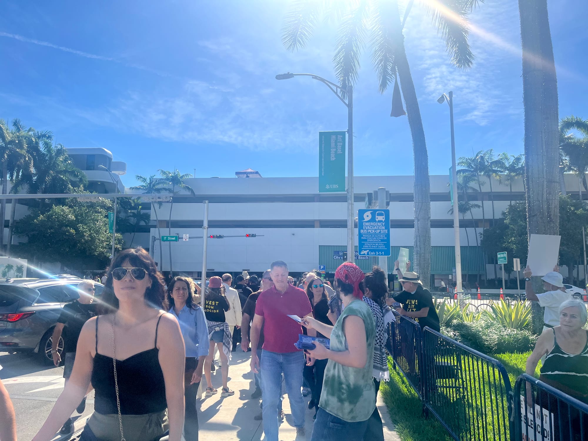 Protesters outside the Miami Beach Convention Center cited fair supporter UBS’s investments in Israeli weapon manufacturing as well as the event’s impact on the local ecosystem.