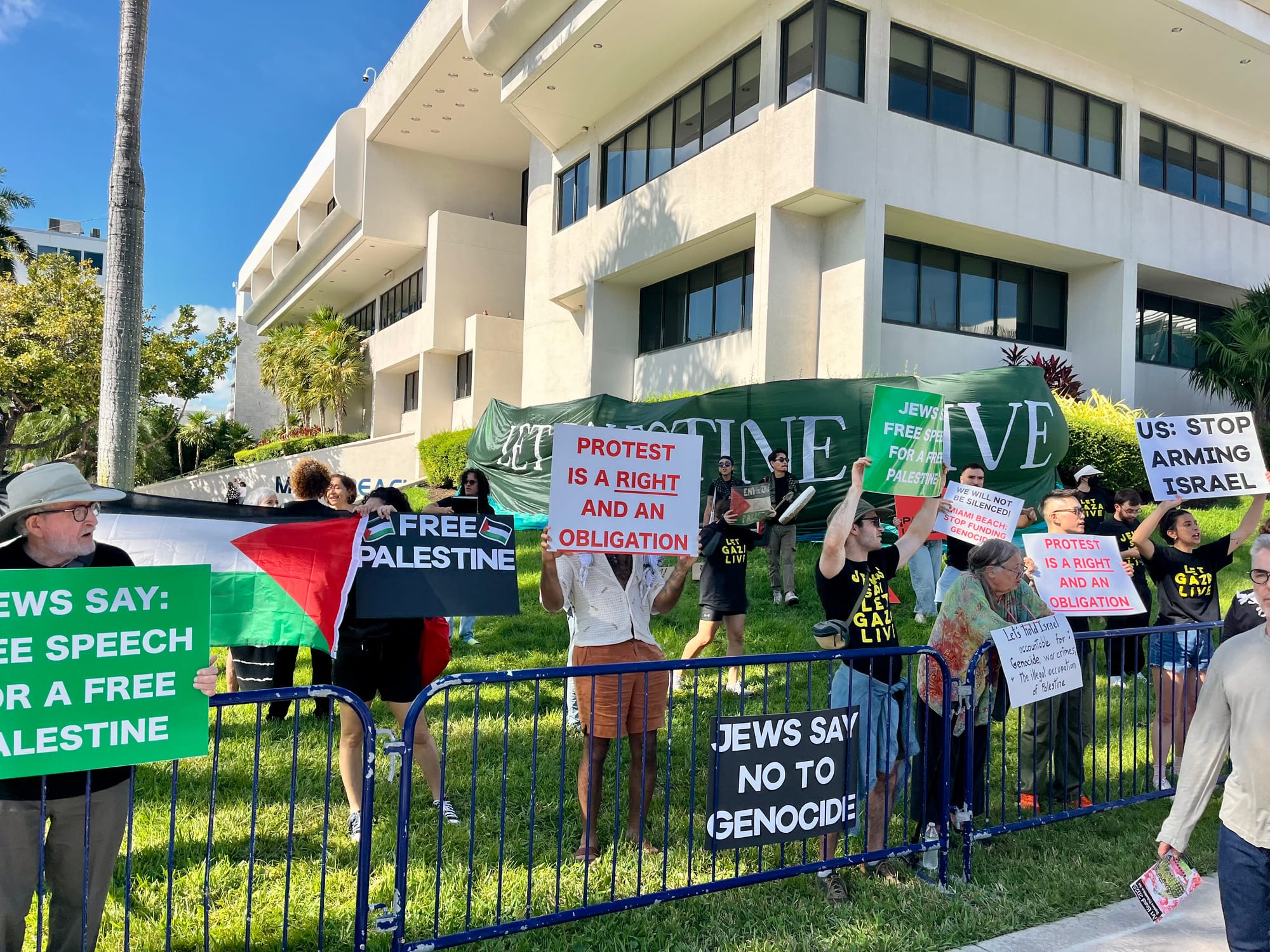 After being relocated from the front of the Convention Center last year by dozens of Miami Beach police officers, several of the organizers are involved in ongoing litigation with the city of Miami Beach over what they allege are violations of their free speech. Chanting from the grass in front of City Hall within view of the fair entrance, dozens of protestors spoke with passing fairgoers peacefully about Israel’s ongoing violence in Gaza and the Occupied West Bank despite a ceasefire.
