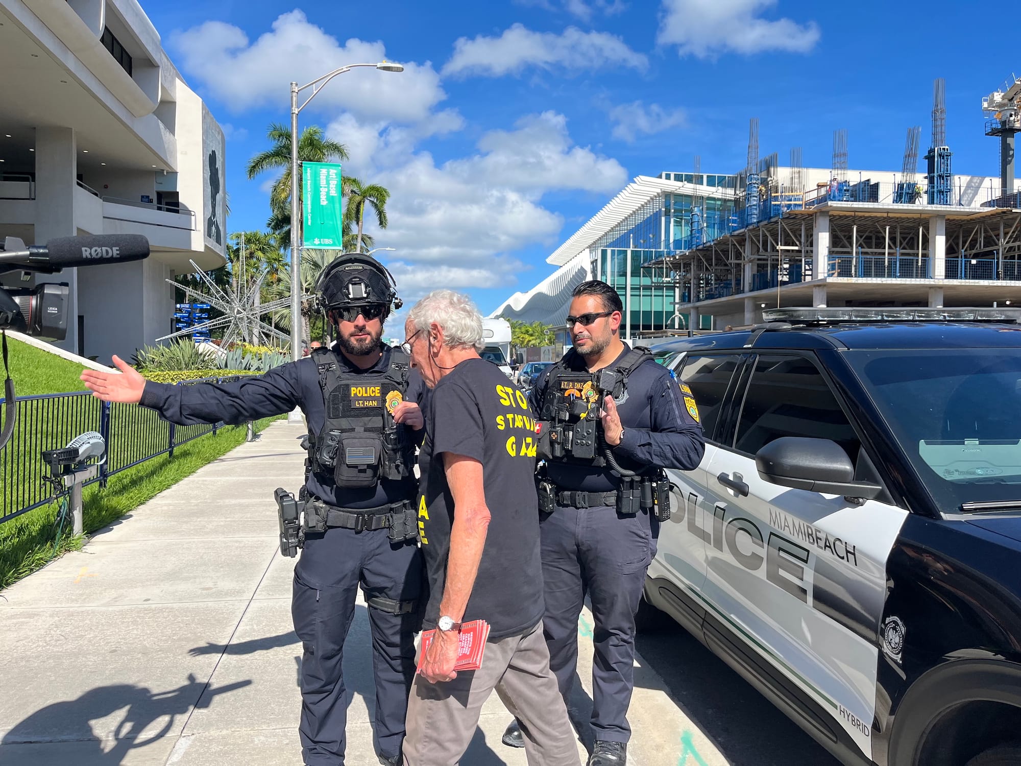 A spokesperson for Art Basel told Hyperallergic that the fair was “in close coordination with the City of Miami Beach and the Miami Beach Police Department to ensure that demonstrators were able to gather in the public area outside the venue, and that visitors could access the fair safely and without disruption.”