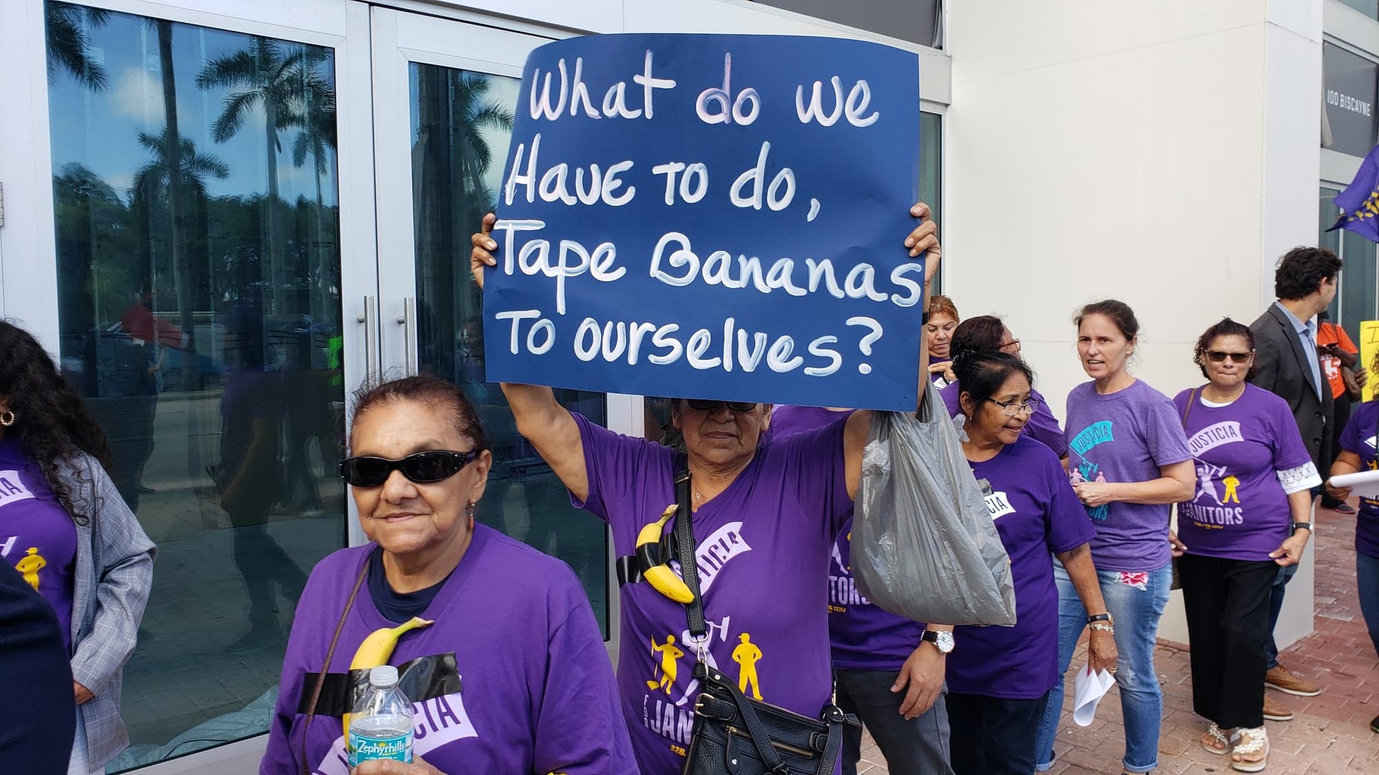 It’s the fruit seen throughout the art world, and a number of janitors in Miami hope it will also help draw attention to their cause. On Wednesday, December 11, janitors donned purple shirts adorned with a taped banana, a reference to Maurizio Cattelan’s “Comedian” that sold for $120,000 at Art Basel Miami Beach. The group of janitorial workers was protesting the low wages and poor working conditions common in their line of work.