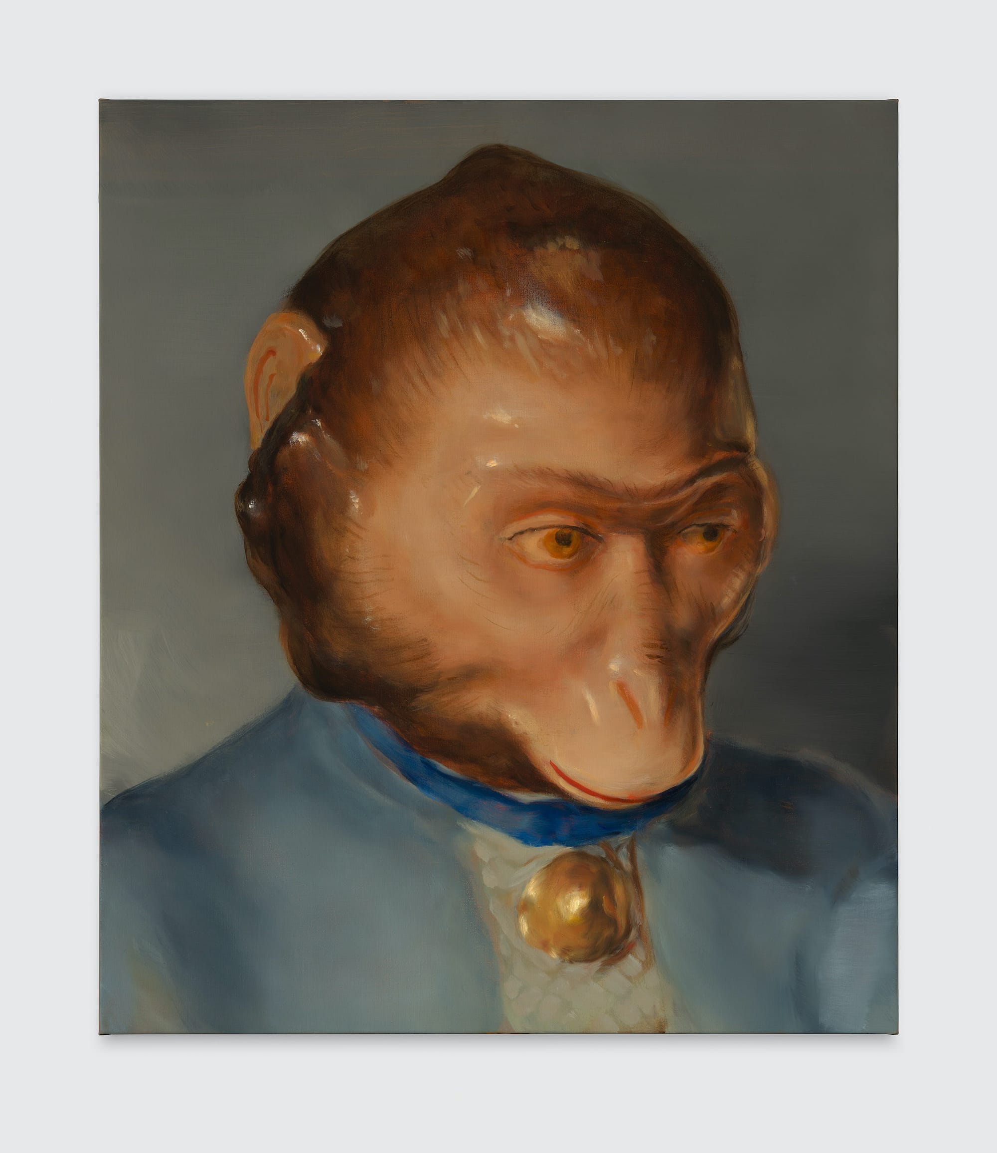 Borremans presents two kinds of portraits in this show. They purport to show us various specimens of humankind, and they offer us several variant portraits of another primate, a monkey.