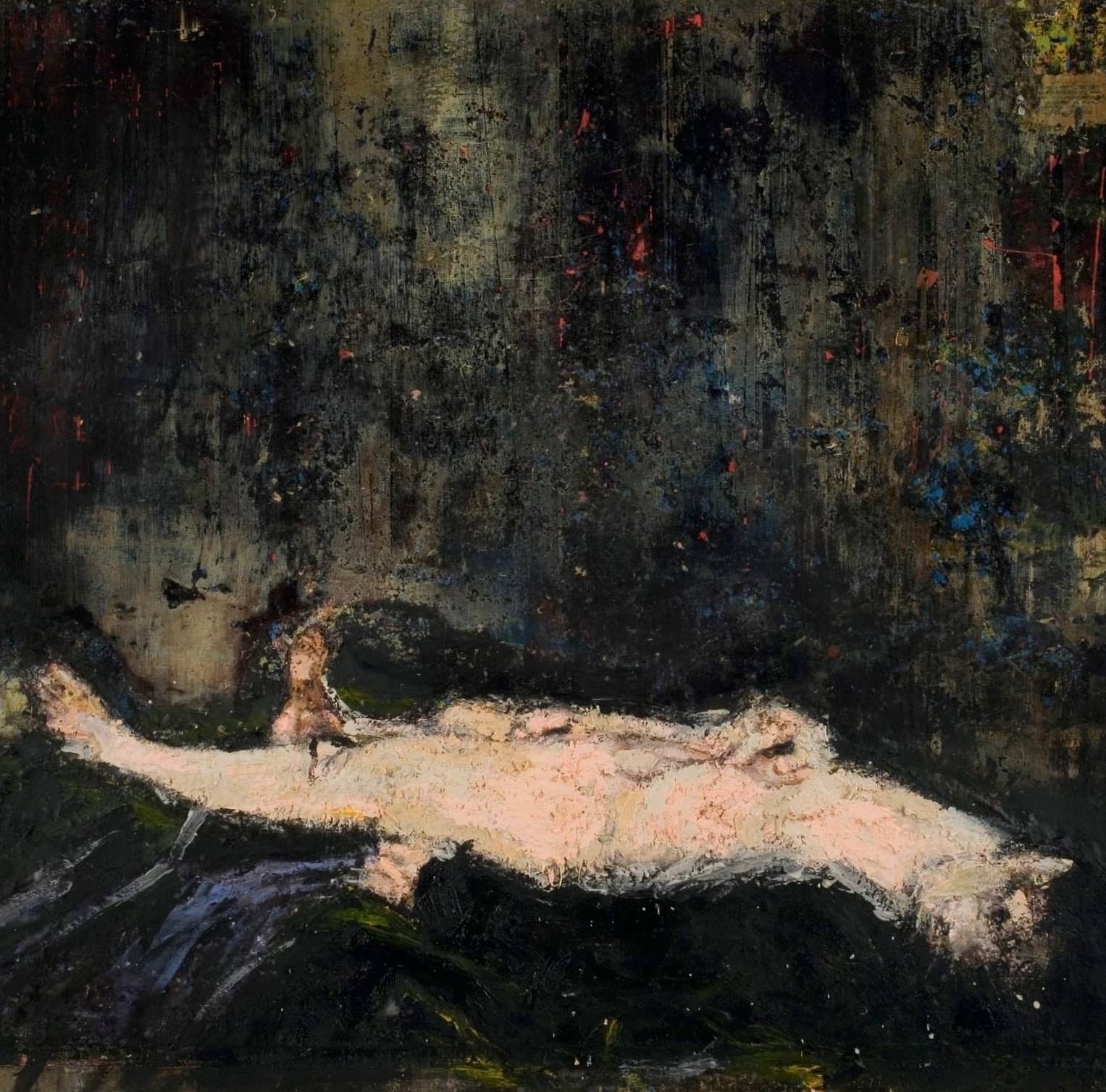 David's “Dead Toreador (After Manet) (quadriptych)” (2003), an acrylic and mixed-media work on four separate pieces of canvas mounted on board, measures 109 by 240 inches, larger than life-size. The fallen figure is set against a streaked, scumbled, scraped ground that shares something with the vigorous brushwork of Abstract Expressionism. After making smaller pieces, working on this scale was a test: Could David make a huge painting or self-portrait? By comparison, “Self Portrait as a Golem” (1998), done in oil and encaustic on wood, is 54 by 59 inches.