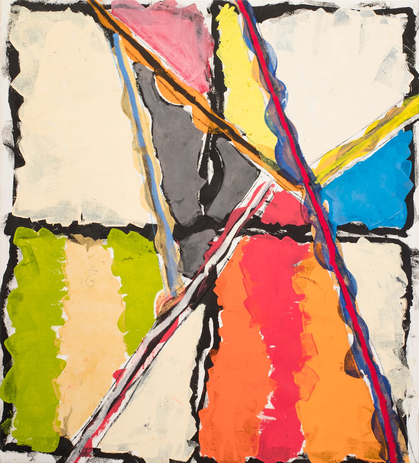What especially inspired me was his commitment to making and living art now: not resting on his laurels or reminiscing about the good old days, not being negative about the art that was happening around him, and not taking anything for granted. I got to know him in the early 90s, and saw his art develop from then until his death in late 2007. Laboring away in Mark Rothko’s dark and cavernous old studio on the Bowery, a former YMCA gym, Goldberg would staple big canvases to the wall and use paint, brushes, scrapers, and juicily fat oil sticks to push and pull the paintings into being. Some were open, airy, colorful, and calligraphic, like Grotto in the Kingdom of Naples (2001). Some were clotted and tangled, black and brooding, like Glass House or Horns of Hymettos (both 2001). Often a rudimentary grid subtly showed itself, as in Untitled (2003), a looming vertical painting roughly 9.5 feet high and 6 feet wide, filled with teetering boxes of gritty scribbled color. Sometimes he deployed overtly cubist geometric scaffolding and spatial division, as in Knossos (2007) and Lindos (2006), two lively and colorful works painted in the last two years of his life.