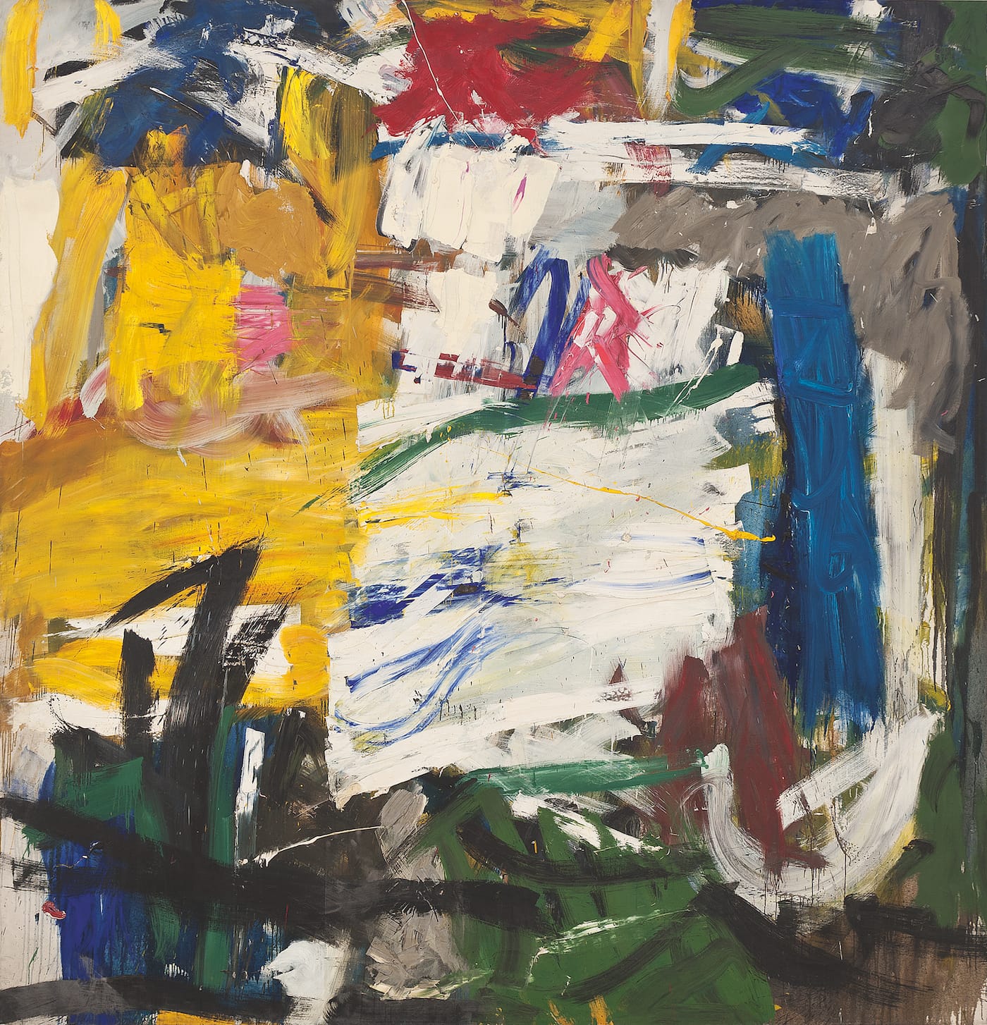 Park Avenue Façade (1956-57) may be the most engaging of the early work in the show. A nearly square vertical, it measures in at approximately 9 feet by nine feet. The painting, echoing its title, is architectonic: dynamic but stable, anchored by a balanced set of strong verticals and horizontals. Its lively surface is vigorously brushed; a fat rectangle of sullied yellows, on the left, abuts a streaky slab of white in the center, which in turn is held in place by a pillar of cerulean blue on the right. The bottom of the painting is grounded by deep greens and browns, while flashes of hot lipstick pinks and reds illuminate its upper half. This was the kind of painting that artists of the day wanted to paint — big, full-throated, spatially and chromatically complex, resolutely reflecting the noisy, gritty urban life that gave birth to it. It feels edgy and improvisational, yet assured — just like the bebop jazz that Goldberg and other artists loved. (Did Mike actually sit in with Charlie Parker at the legendary Five Spot Café on Cooper Square, as he claimed? Probably not, but it was a good story — and he did, along with his Abstract Expressionist friends, frequent the jazz club and pay for his drinks with art.)