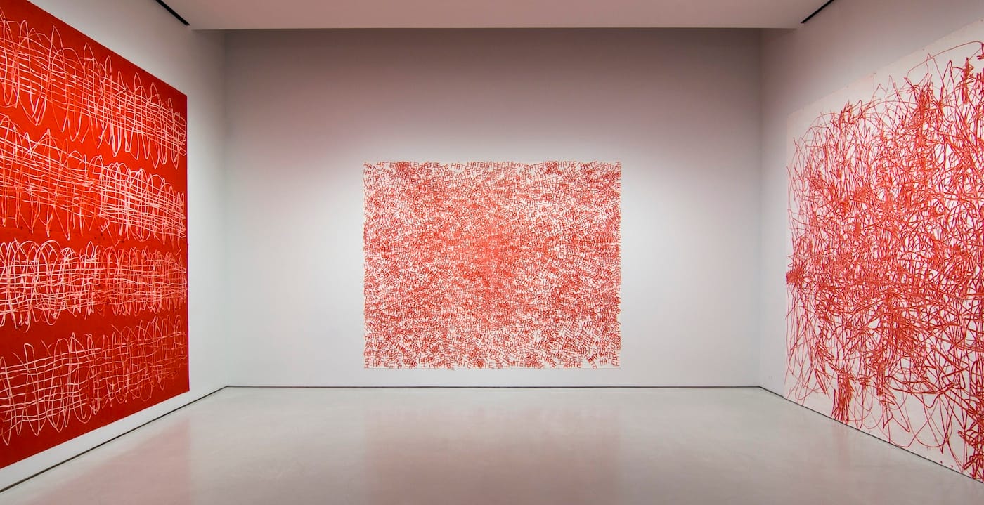 The drawings themselves are technical marvels. Ranging in size from minuscule to monstrous, they are done entirely in red and white oil stick, with the image scraped away via a sgraffito procedure. One of the two colors comprises the ground, which is subsequently coated in wax as a resist and then covered in the second color. Over this, the artist makes a pencil drawing of an appropriated, invented, or adapted image, and then proceeds to scratch away the figure with unerring accuracy.