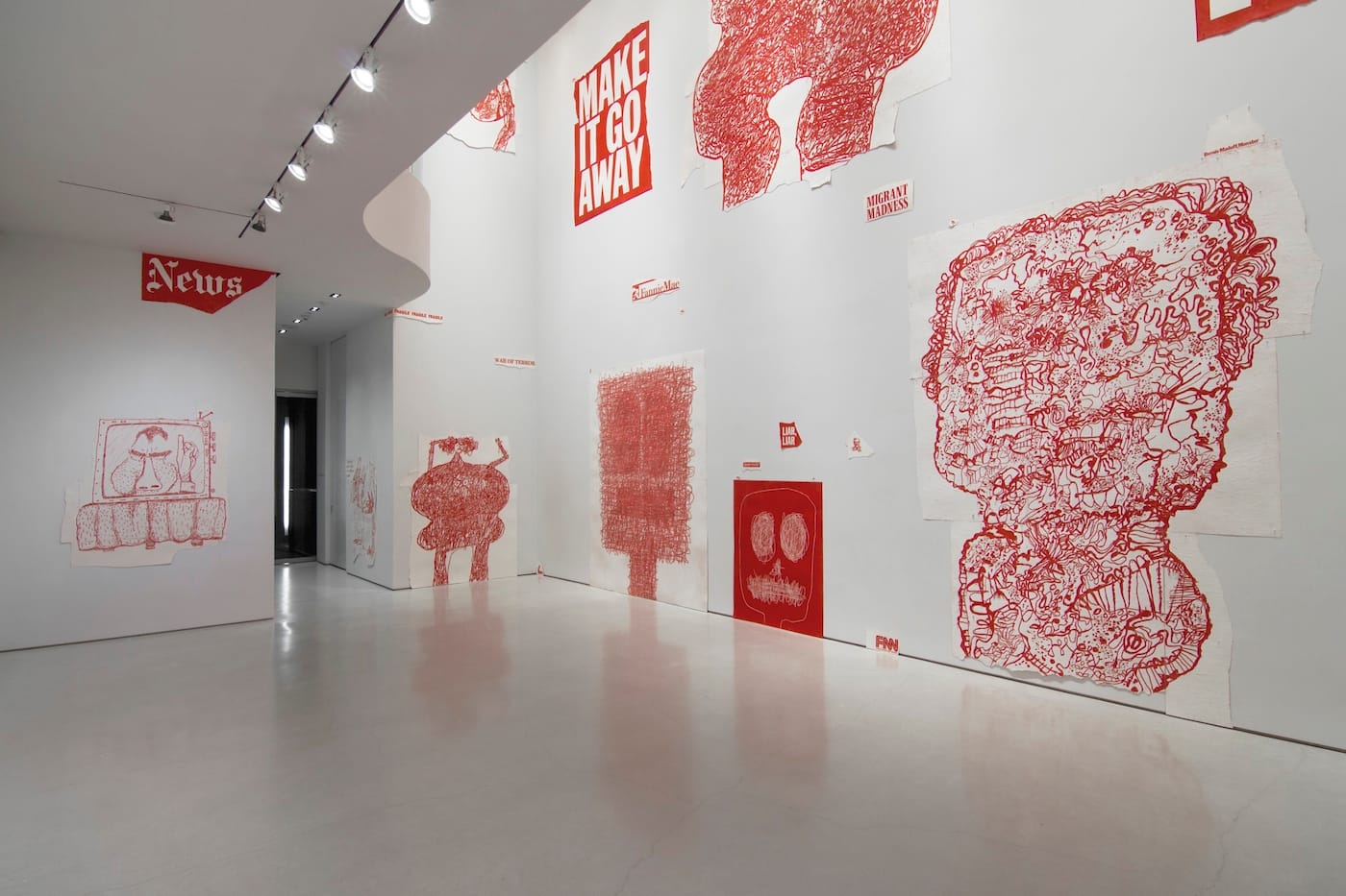 The first floor is decidedly different from the second and third, even if it is filled, again, with white-over-red (along with several red-over-white) drawings. The scale is much larger here, and the appropriations are more exacting, with outsized copies of Philip Guston’s Nixon drawings and Jean Dubuffet’s expressionistic takes on women and heads, along with text pieces loaded with billboard-size letters spelling out “MAKE IT GO AWAY” and “GOT HIM!”
