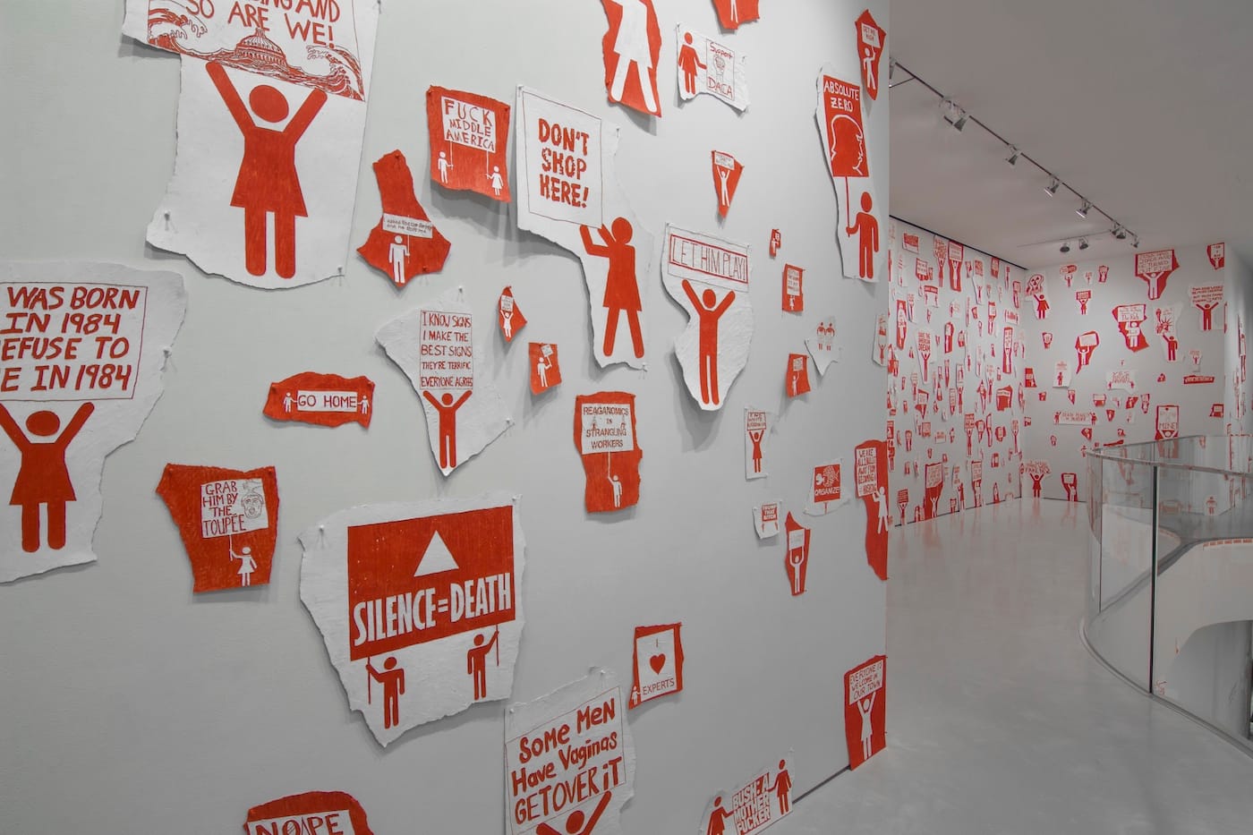 The flip side of randomness is found on the gallery’s two main floors, where Landy seems to be rushing in to fill the vacuum he created with Break Down by vacuuming up every political slogan and rant he can find.