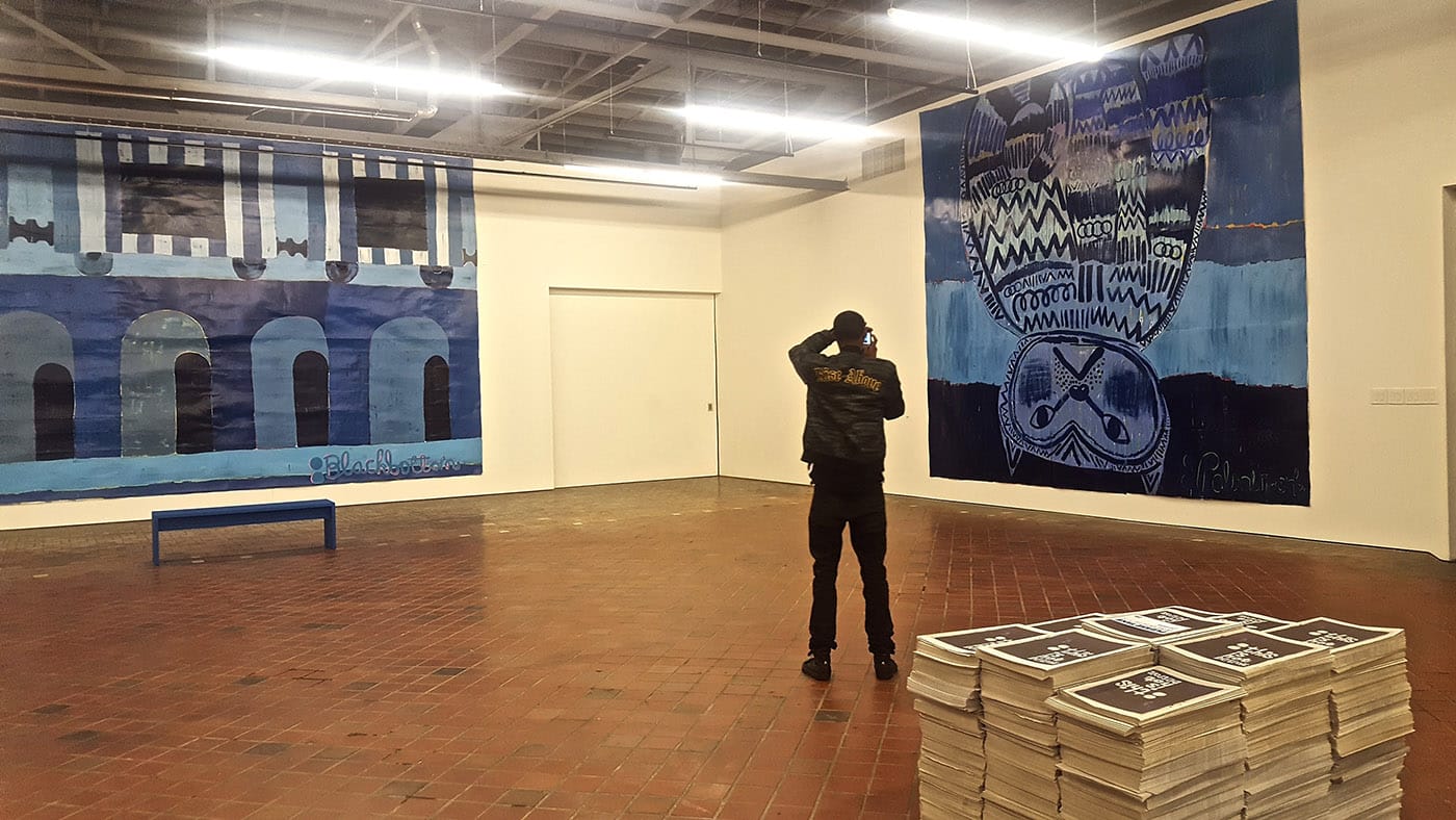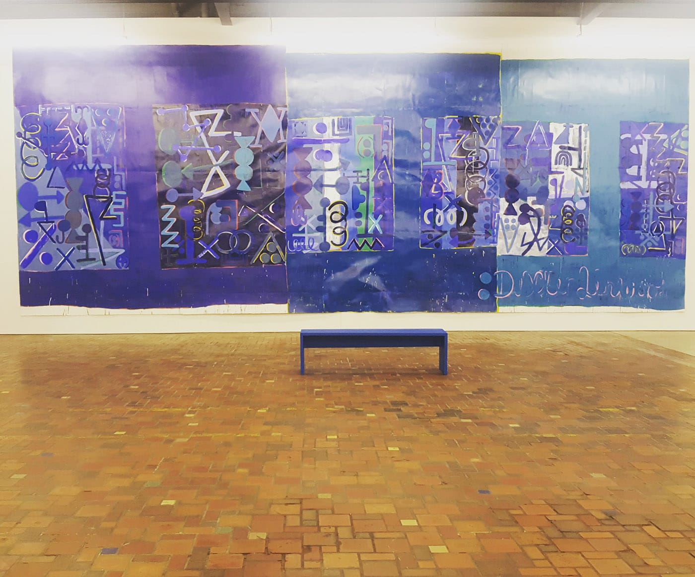 If Luchs sets the bar high, Copenhagen-based artist Tal R (Tal Shlomo Rosenzweig) answers with a series of massive paintings and a newsprint publication, collectively titled : this is not Detroit, in the MOCAD’s main gallery. The strict yellows and reds punctuating Luchs’s palette are countered by oceans of blues in Tal R’s. Despite the exhibition’s declaration, each of the seven huge, multi-canvas, mural-like works on display takes inspiration from a different Detroit neighborhood, and the motifs and ambiance of the exhibition feel very much like Detroit, indeed.