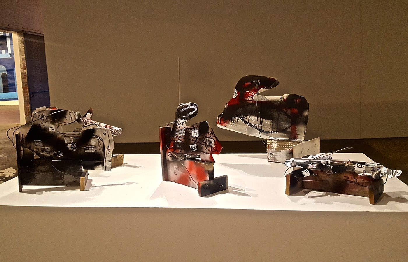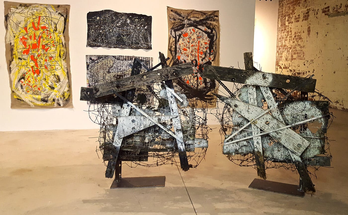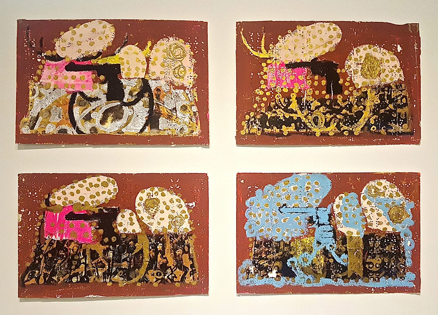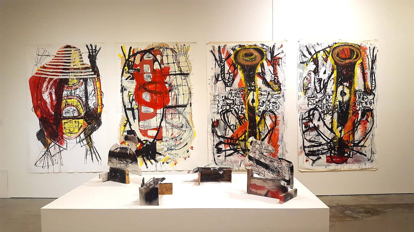 MOCAD is situated in the footprint of the Cass Corridor, but current development has rebranded the area “Midtown,” and as it is among the fastest-rising neighborhoods, one must squint to find any trace of the original grit that for decades made the Cass Corridor a notoriously sketchy place to hang. That grit is evident and dynamically alive in Luchs’s work, mostly large-scale paintings and drawings, and small to medium sculptural creations, assembled from and in conversation with the scrap and salvage that was the bedrock of Detroit’s waning infrastructure for many years.