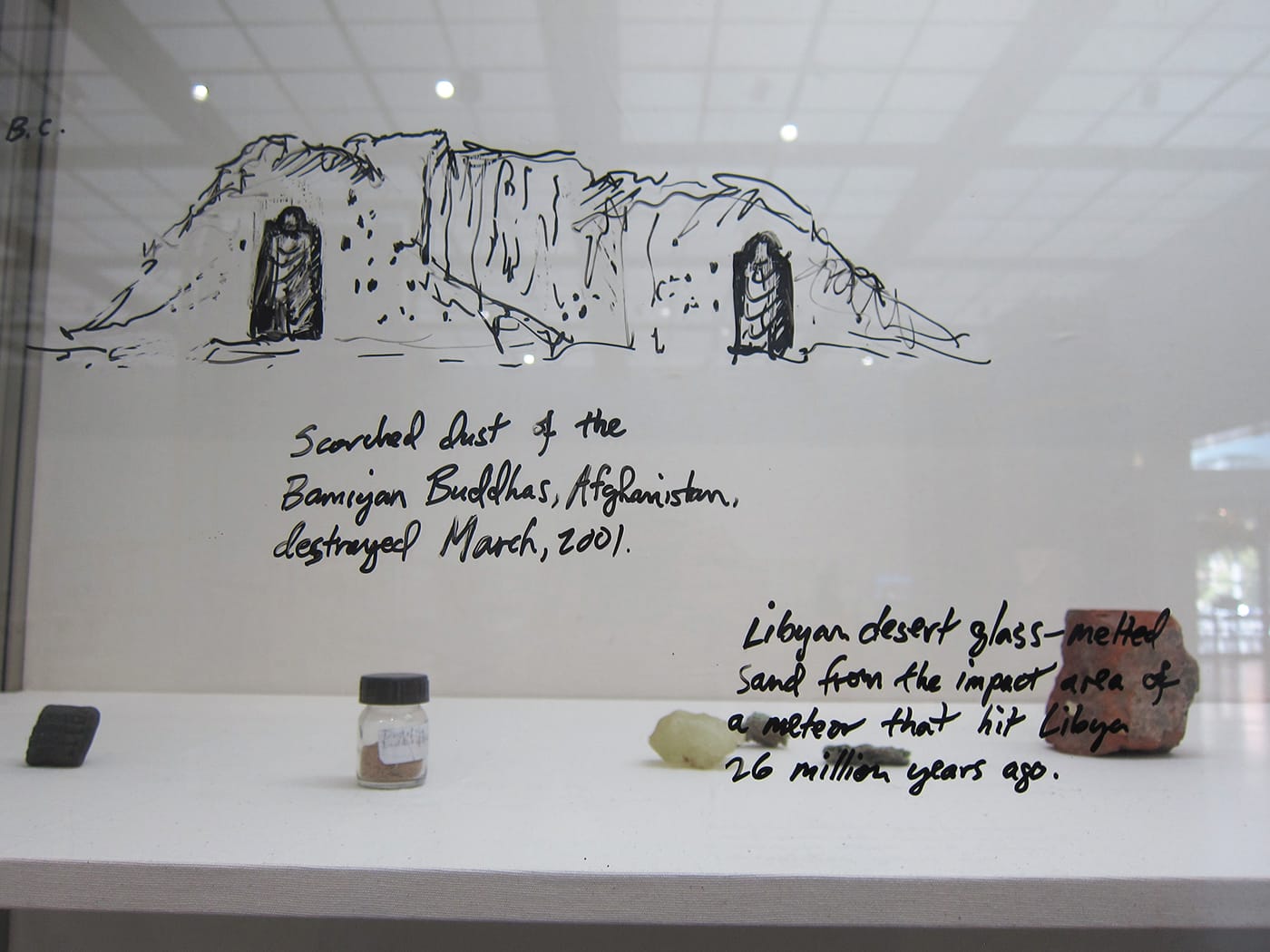 Yes, of the Star Wars trilogy. Such strange, surprising nuances are embedded throughout the exhibition and can easily be overlooked. Like “Return” — shown here in the form of a video chronicling the saga — Rakowitz’s work is incredibly involved, heavily researched, and centers on unexpected connections, and each of his installations is accompanied by a copious amount of explanatory wall text. Highlighting two decades of Rakowitz’s thought-provoking work, Backstroke of the West is a dense and challenging display, but it does important work of exposing the marginalized realities of war. Much of the exhibition refers to histories related to the US-led invasion of Iraq (Rakowitz is Iraqi-American) although dismal records of violence in other countries appear in the installation What Dust Will Rise?, which frames mundane material from disaster zones as valuable specimens.