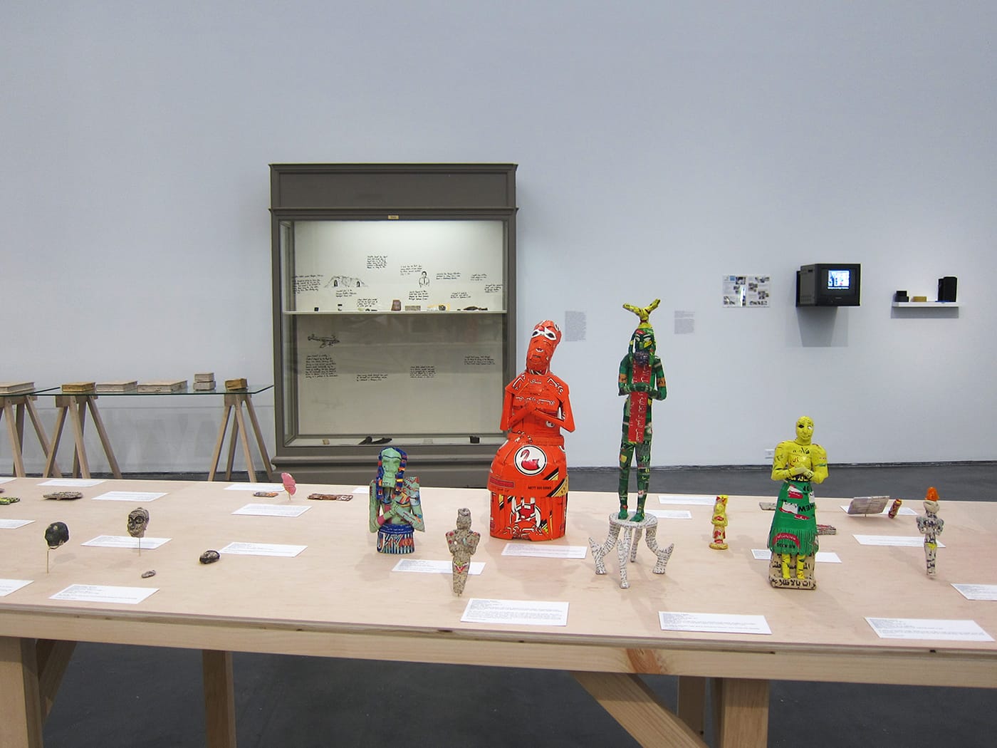 Organized by curator Omar Kholeif, the exhibition includes Rakowitz’s ongoing series, The invisible enemy should not exist, for which the artist and his assistants are fabricating artifacts looted from the Iraqi National Museum in 2003. Each sculpture is made of found detritus such as newspaper and food packaging — material that speaks to an urgency to replace objects that are lost, invisible, even, having been stripped of provenance and placed on the black market. Yet, they assert that history cannot be completely remade. They stand as tragic effigies of treasures forever gone, similar to Rakowitz’s reconstruction of the Ishtar Gate that stands at the exhibition’s entrance, made of plywood and plaster. More accurately, his wooden gate is an imitation of the crude replica that stands in Babylon, commissioned by Saddam Hussein to replace the original — which, again, cannot truly be recreated.