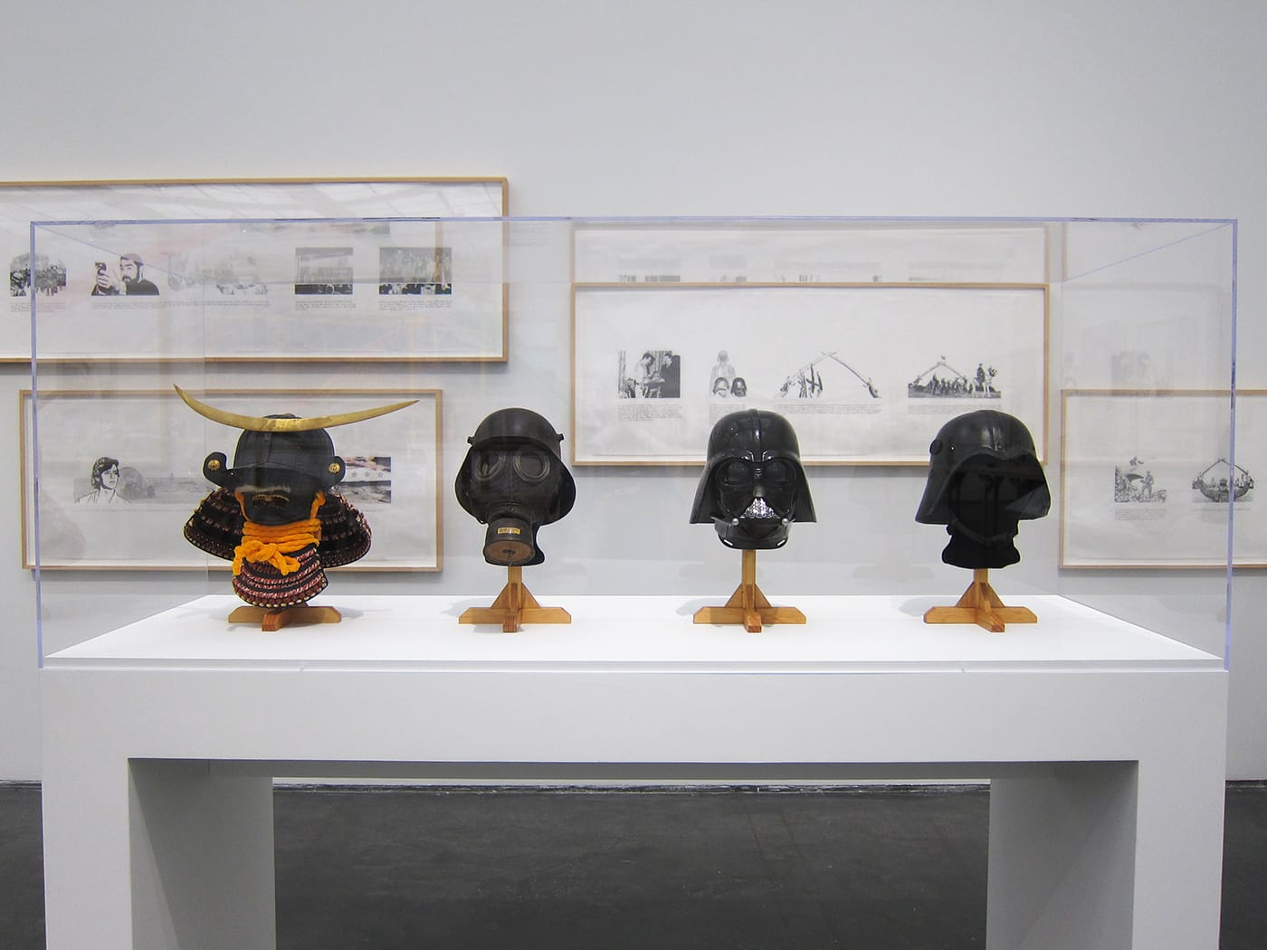 Pillaged artifacts can turn up not only on distinguished platforms like Sotheby’s but also on eBay, which is where Rakowitz found one of the strangest objects in the exhibition: an Iraqi paramilitary helmet modeled on Darth Vader’s ominous headgear. Sold by an American soldier who had found it in Mosul, the helmet was one designed by Uday Hussein, who, it turns out, was a fan of Star Wars, as was his father. It’s displayed alongside a Darth Vader helmet, near a sculpture that further conflates fantasy and fact in Hussein’s military regime. Rakowitz created a version of the Swords of Qādisiyyah in Baghdad, known as the Victory Arch, which is formed by two giant hands raising swords. On the eve of the first Gulf War, Saddam ordered soldiers to march beneath it to the Star Wars theme song. In Rakowitz’s version, the hands instead wield lightsabers.