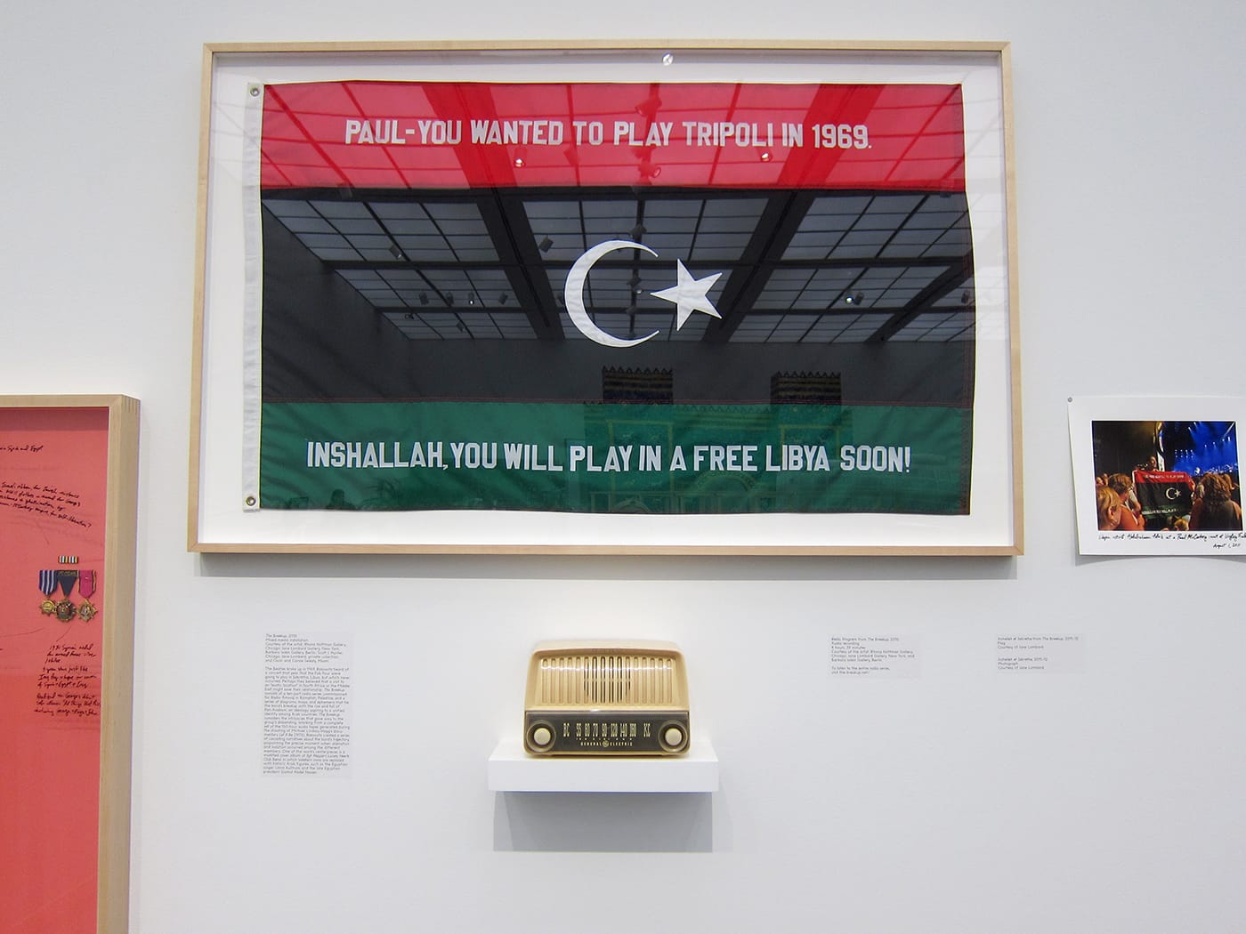 These objects not only suggest how weaponry communicates a particular class of power but also speak to the cross-pollination of cultural influences that can birth absurd narratives edging on myth. Rakowitz, who has a knack for seeking out unusual associations, is attracted to this kind of storytelling that appears to weave reality with fantasies. One notable series wildly reimagines the breakup of the Beatles as an echo of failed geopolitical negotiations.