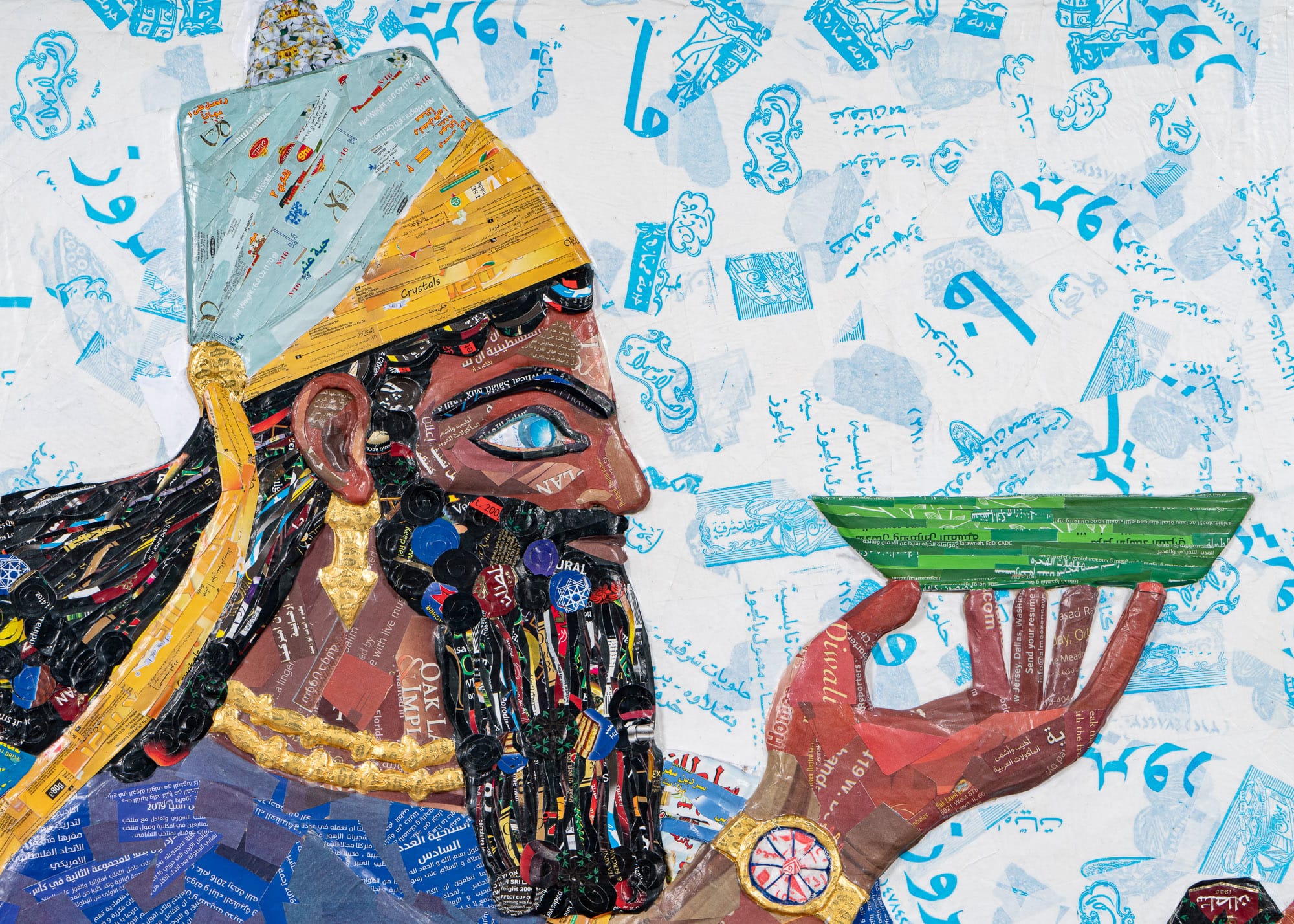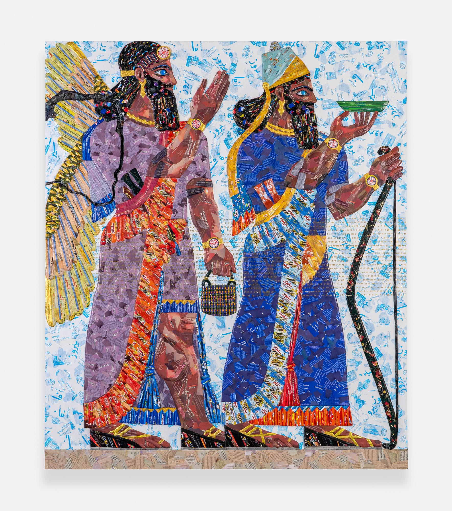 But next to the gaps are startlingly beautiful resuscitations of the reliefs in glorious reams of color that come from the wrappings of food items that originate in Iraq. The artist and his team of studio workers (he’s very careful to define this as a collaborative project) have created the faux reliefs with papier-mâché and cardboard that use the food packaging to form astonishingly vivid mosaics that give fine detail to clothing, jewelry, beards and hair, and skin tone. Crucially, these are all comprised of everyday materials that almost anyone could procure — affirming that this act of historical recovery may be made by not only art school elite or well-researched historians, but anyone who sees themselves in these reliefs and dedicates themselves to the task. In working on this project for 14 years, Rakowitz and his studio workers have resuscitated 900 missing or stolen pieces.