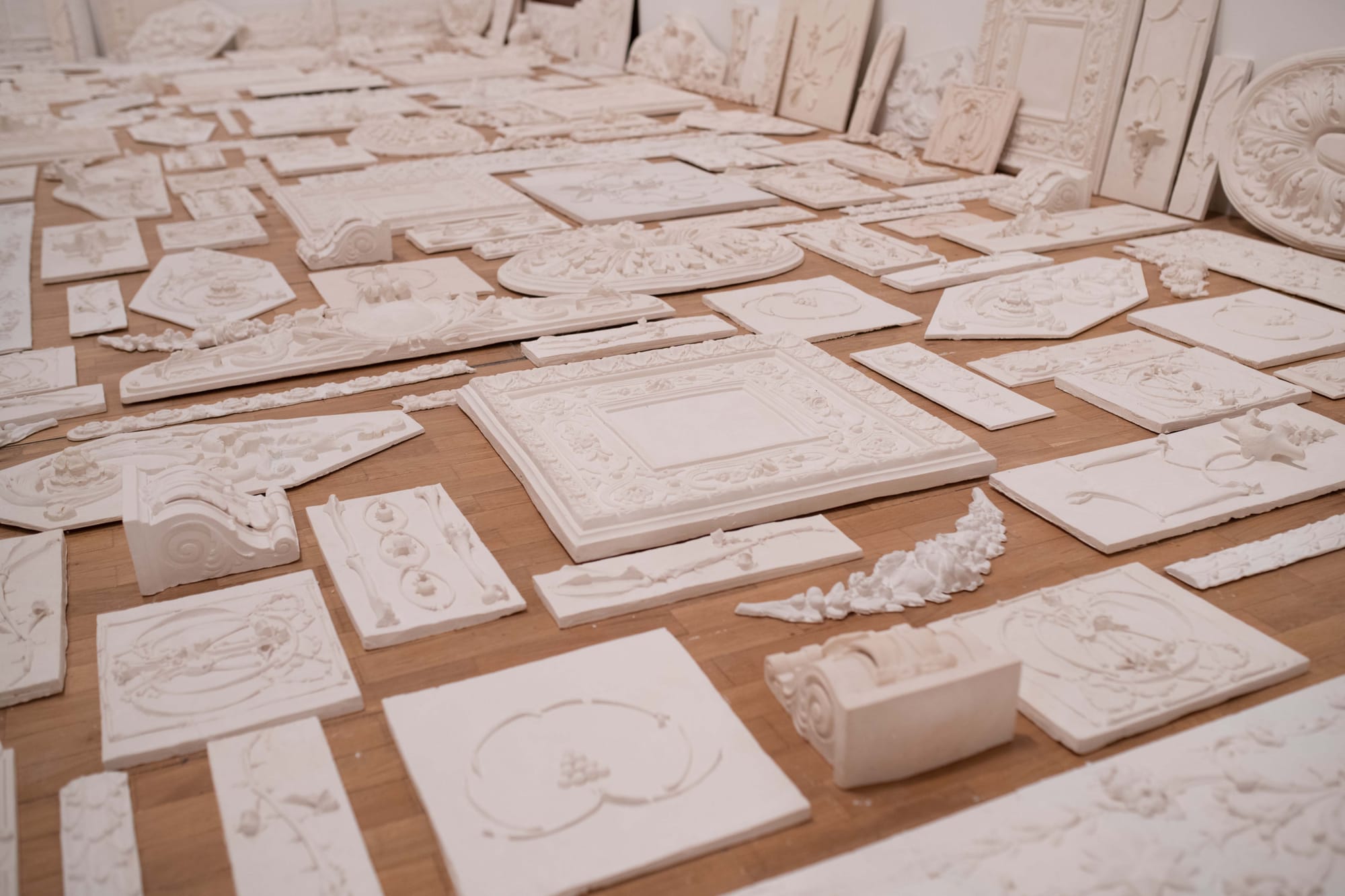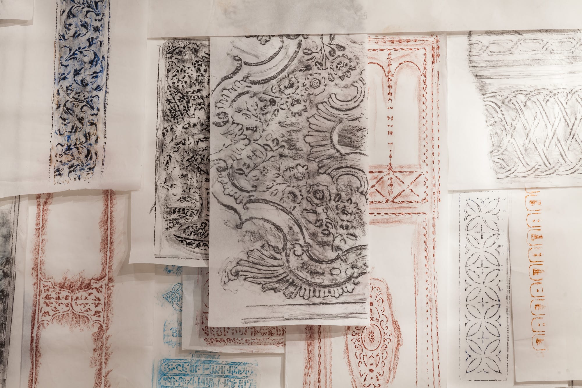 Rakowitz’s look back to cultures — and more explicitly their citizens — of the past is most dramatic in a room dedicated to rubbings on paper and plaster casts of the architectural details to Istanbul’s buildings made by Ottoman Armenians. “The Flesh is Yours, The Bones Are Ours” (2015) was made for the 2015 Istanbul Biennial, which also happened to be the centenary of the Armenian Genocide, and consists of plaster cast replicas of Istanbul’s Art Nouveau buildings, cast from real animal bones. Much of this ornamentation was made by Armenian craftsmen, many of whom perished during the 1915 genocide, which Turkey has yet to recognize. Displayed alongside the plaster casts — made with animal bones from livestock descended from farms historically owned by Armenians — are rubbings made from the facades of these buildings, as well as photographs, and histories of the craftsmen and their ateliers, giving names to the forgotten and unrecognized ghosts of Ottoman Istanbul.