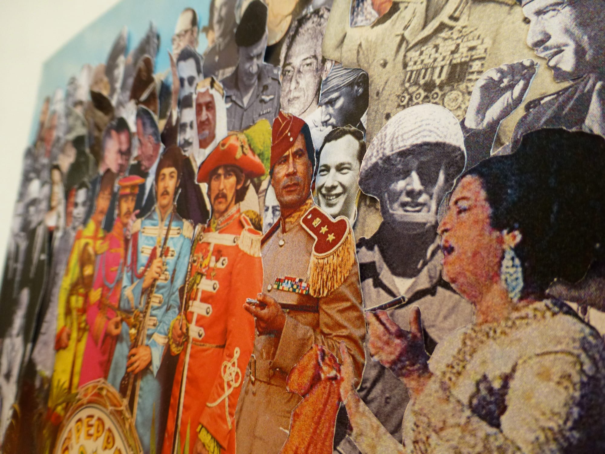 Rakowitz also brings aspects of different worlds together in “The Break Up” (2010–ongoing), a set of works that parallels the Arab-Israeli Six Day War with the release of the Beatles’s Sgt Pepper’s Lonely Hearts Club Band in 1967. A Rolling Stone magazine with a photograph of George Harrison appears next to an issue of TIME with Yasser Arafat on its front page. Meanwhile, Peter Blake and Jann Haworth’s infamous album cover now includes Egyptian icon Oum Kulthum. In fact, within the works — which comprise Beatles memorabilia covered in Rakowitz’s scribbles — the artist compares each member of the band to the four quarters of Jerusalem, making us question whether there may, in fact, have been a link between the British band and the quest for peace in the Middle East, while also reminding us of the band’s popularity outside of the West.