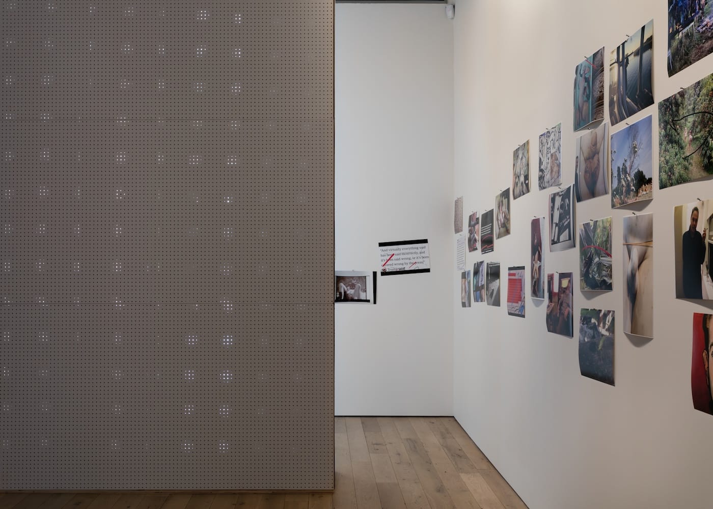 A warning shot in the form of a sheet of printer paper is taped to the door of the Chinatown gallery: This exhibition contains graphic images that may not be suitable for children. Indeed, the series of C-prints ranging across the floating walls (built by Auder’s former collaborator, the artist Servane Mary) cordoning off the show’s central vestibule, are provocative not only in content, but in sheer volume. Secured crookedly by thumbtacks and arranged in conspiratorial clusters, these images rs resemble the pinned-up evidence collected by a frenzied detective, a motif reinforced by the floating walls’ pegboard texture and the jagged lines and annotations that cut across the photos, sporadic markings from an inconclusive investigation.