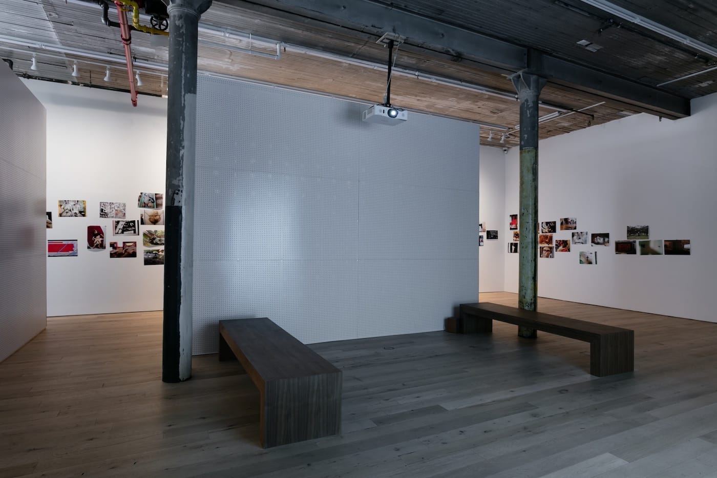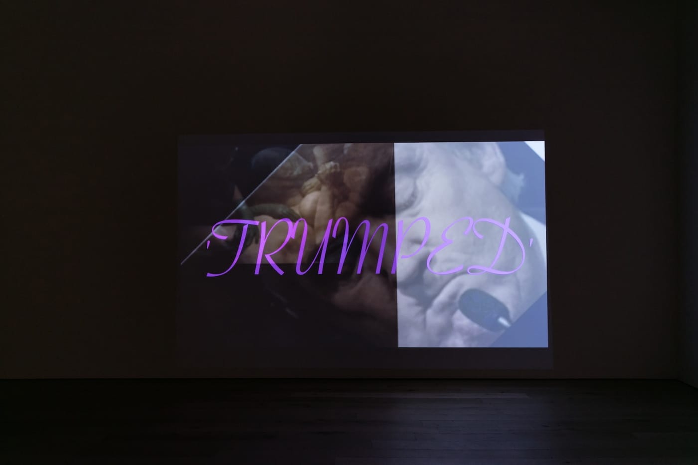 The photos taper off. Respite? Comprehension? Not today. Stunned and slack-jawed, you find yourself ushered into a semi-enclosed screening room. Two benches jut outward from a floating wall, perpendicular to a massive projection. The odds are good that, at whatever moment you wander in, you’ll be greeted by a larger than life-size still photo of our President’s face, cropped and rotated at an unsettling angle, no doubt captured while accenting the wrong syllable of some racially charged invective. A title card in garish purple script announces the name of the video, which loops to a Matthias Grübel soundscape, reverberating through the gallery: TRUMPED.