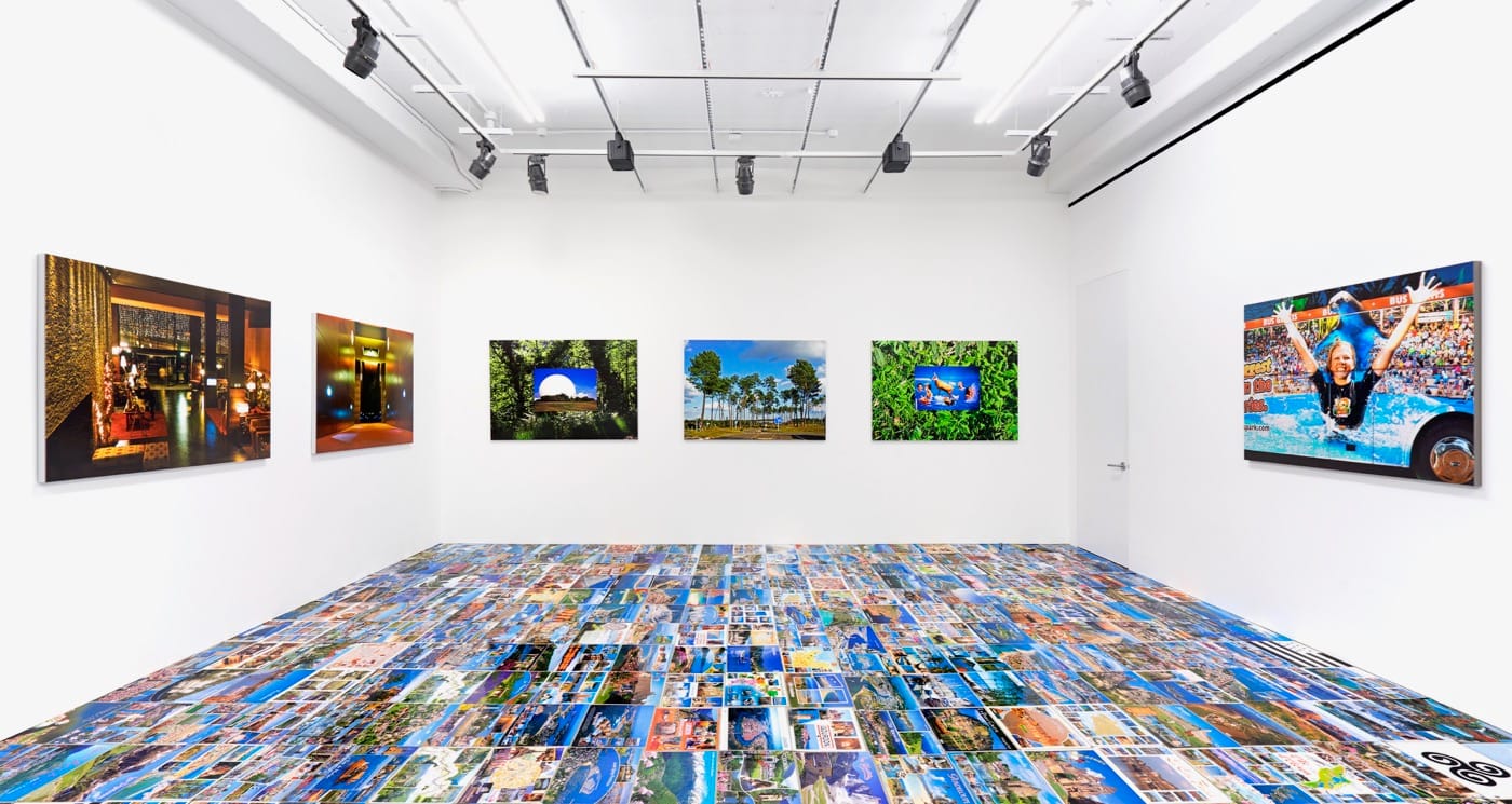 As the title of the show suggests, the dour lens through which Houellebecq captures the city captures a violent evacuation: most photographs depict empty city streets from a bleak aerial view and function as would an empty page waiting to be filled with language. “Houellebecq talks about a grammar of images, treating images like words in paragraphs and chapters, and rooms like chapter separations,” explains Fischman. French Bashing is divided into two antithetical rooms: one very dimly lit, with lights pointed directly at the photographs, and the other overwhelmingly bright with vibrantly colored, kitschy tourist placemats completely covering the floor. Overheard are two distinct audio tracks composed by Raphaël Sohier. In the dark room, one can hear sounds of wheels over train tracks and the wind whipping against the locomotives implied in Houellebecq’s photographs of empty spaces. The trains have replaced people. No human sounds are audible. In the second room, however, Sohier has produced a soundtrack of children’s laughter, echoing among photographs of hyper-commercial spaces in largely peri-urban zones — amusements parks and global supermarket chains. Walking from one room to another is literally night and day, with the second, vivid room acting as a sort of exposé of the ways in which the tourism industry tricks us into believing in a country’s happiness. The signs and placemat may be bright and joyful, but the streets are still empty.