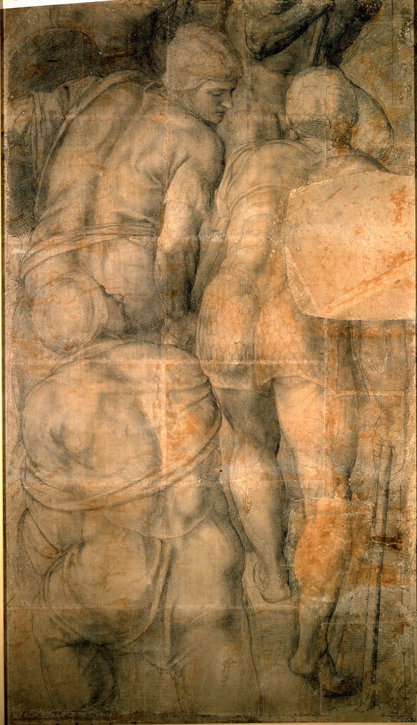 Within eye view of the Bastiano, on a stand in the middle of the floor, there is a small preparatory study that Michelangelo made for the fresco. Although this is an unfair comparison, because it matches apples to oranges (an oil painting on wood against a black chalk drawing over leadpoint on paper), the contrast between the two is revealing of Michelangelo’s concept of form, space, and the interaction of medium and surface.