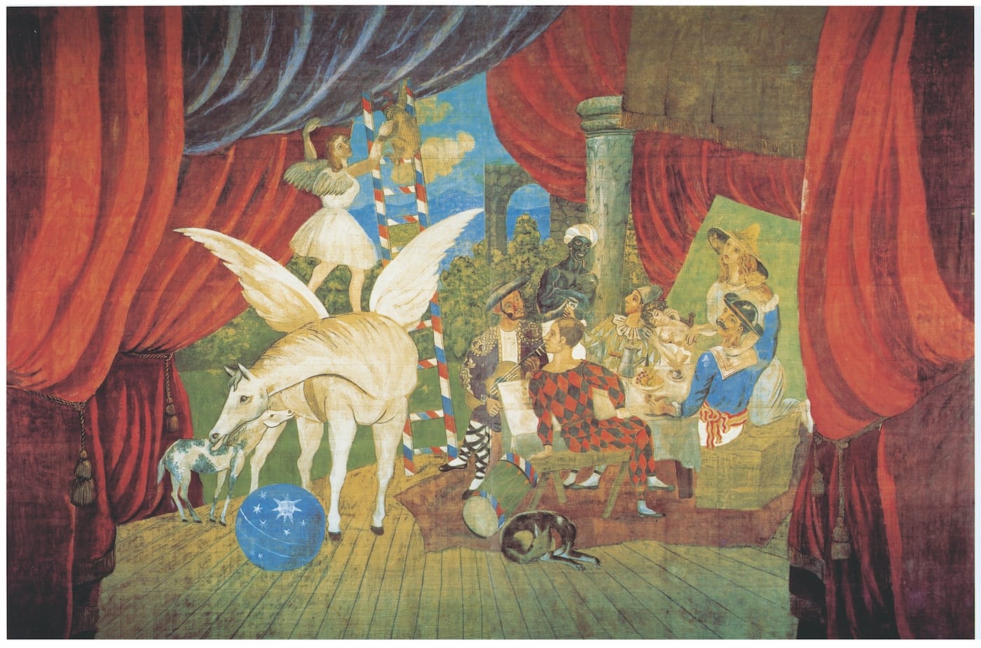 “Parade” (1917), Picasso’s painted stage curtain for a Sergei Diaghilev ballet of the same name, is more than twice the size of the colossal “Guernica” (1937), his landmark anti-war statement of unmitigated suffering.
