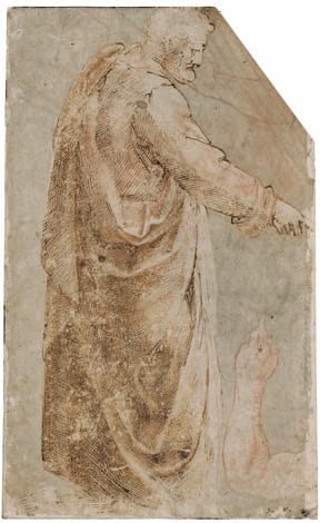 Sketched around 1492, when Columbus sailed the ocean blue and the artist was all of 17 years old, the drawing is a copy of a detail from “The Tribute Money” in the Brancacci Chapel of Santa Maria del Carmine in Florence, the landmark fresco painted by Masaccio around 1425.