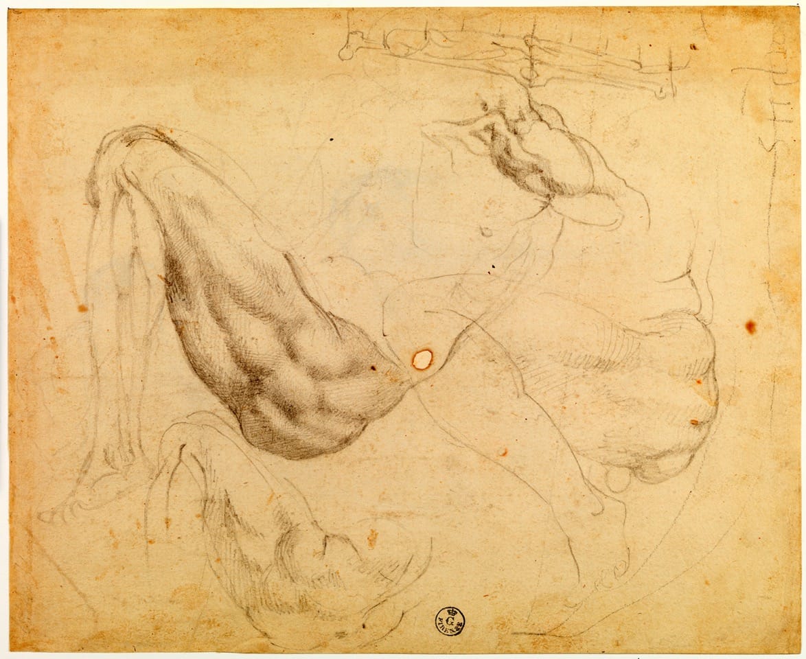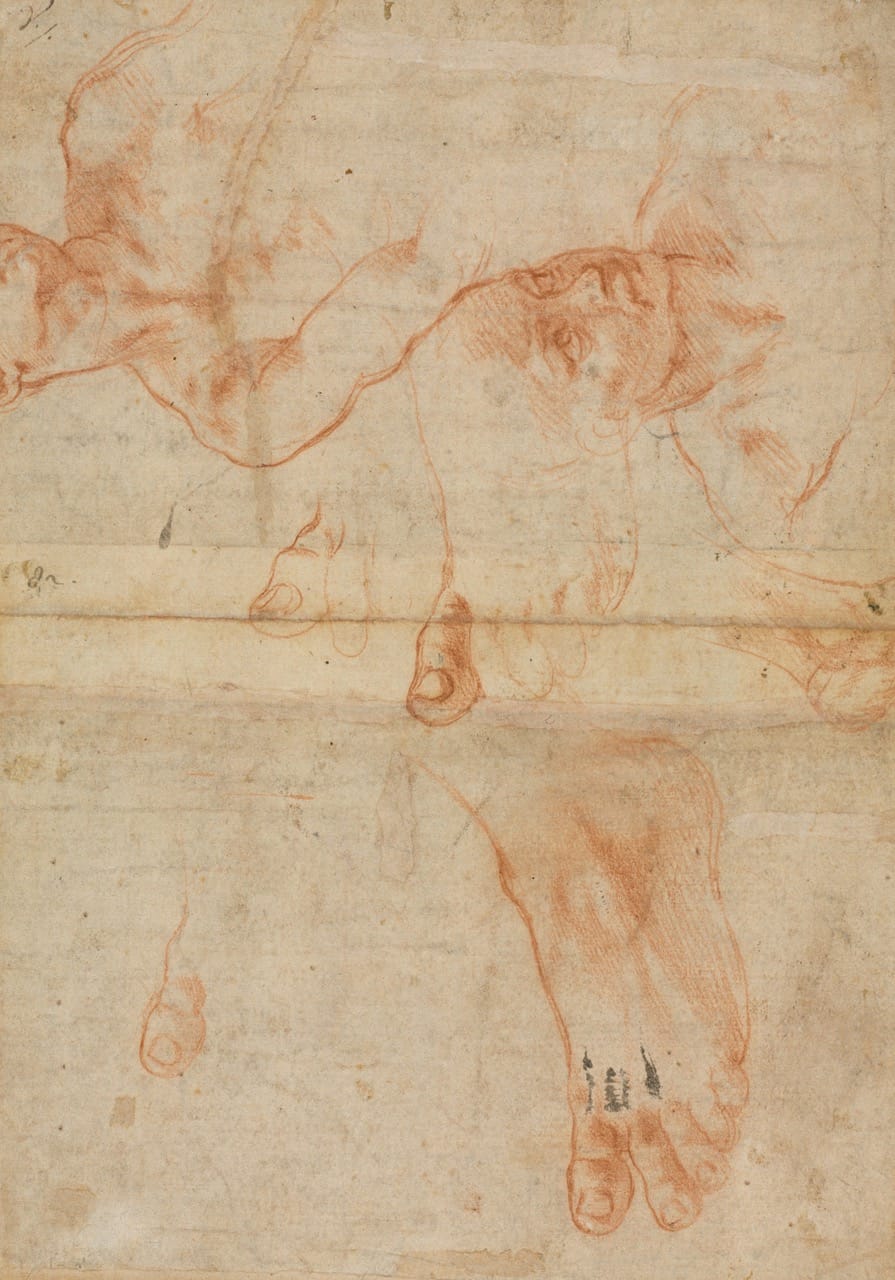 Michelangelo is at his quixotic best when his drawings imply formidable forces of a kind of Nietzschean affirmative nihilism where new relational affects and intensities are assembled. Perfectly finished, polished drawings, like “Tityus” (circa 1530–32), “Il Sogno” (The Dream, circa 1530’s) and “Archers Shooting at a Herm” (circa 1530–33) are admirable but dull by comparison, for me. They, like his masterpiece sculpture “Pietà” (1499), suffer from what I consider Michelangelo’s prestige problem. Their accomplished resolution, their dazzling technical virtuosity, their clichéd fixity as finished objects, tied to their overwhelming acclaim, make it difficult for me to implicitly enter the pieces and join them — and thus them join me. By contrast, the virtuoso incompleteness of the fragments in “Studies for Sistine Ceiling” opens the artwork up to virtual, imaginative, and mnemonic spaces. The central toe, on which the composition pirouettes, harks back to Michelangelo’s Virgin Mary’s missing nose.