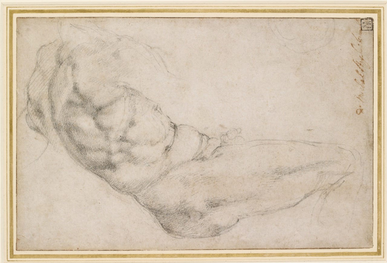 The topsy-turvy “Incidental Sketches” by Michelangelo and his pupils displays the generative force of deviation. The conceivably onanistic “Study of reclining nude in the Medici Chapel with measurements” (circa 1520–1530), like the “Study of torso of Dusk in Medici Chapel,” is a muscular and phantasmagorical plunge into where being and non-being reverse into each other. Through ontological upheaval it offers new regimes of attraction/repulsion to pursue.