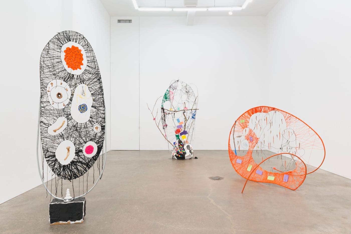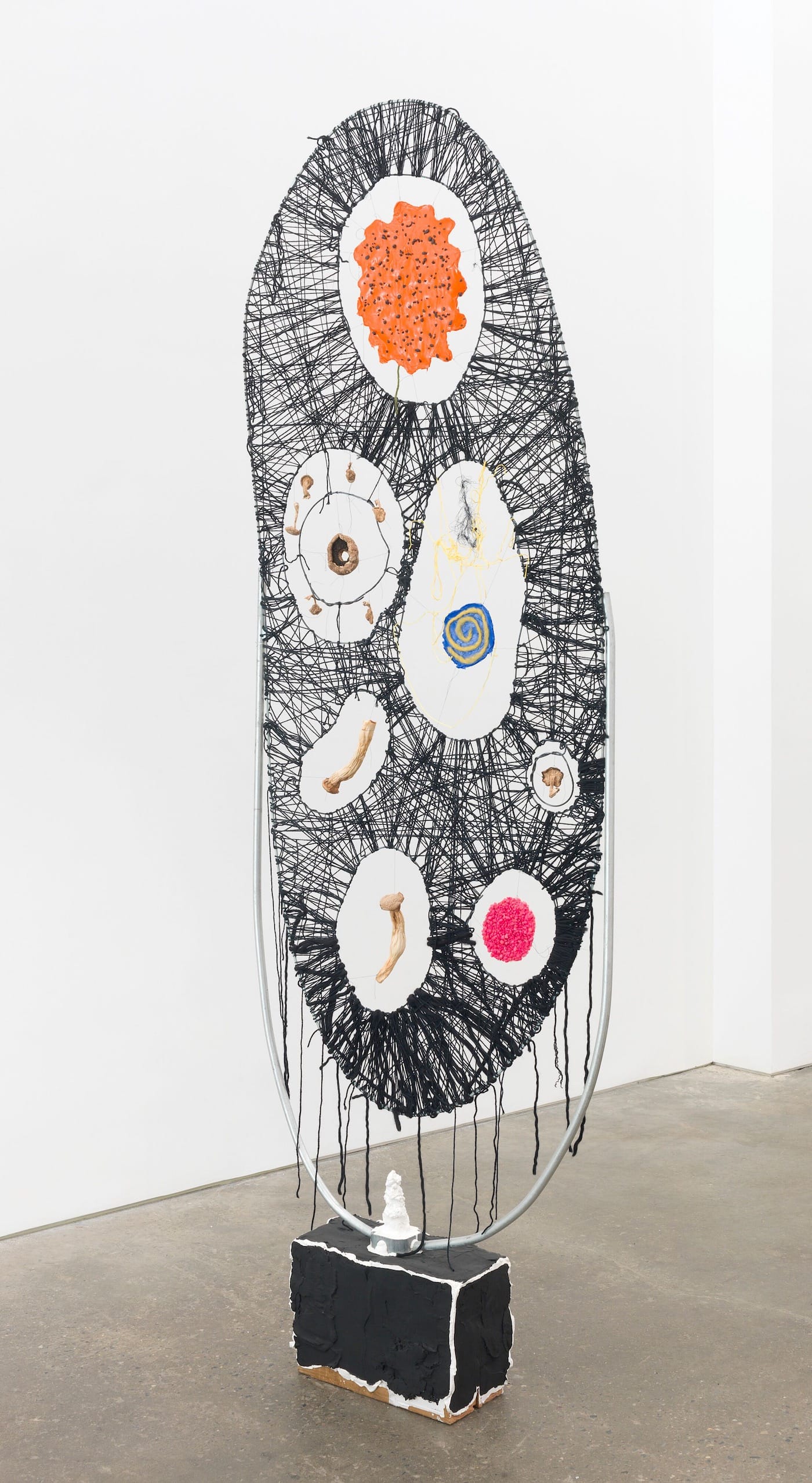 “Voidsorption” (2017) is an irregular, stretched-out metal oval whose empty interior is crisscrossed by black yarn, which rises from a mostly black, brick-like form. There are seven circular openings inside the oval, seemingly suspended by the yarn, with mushrooms of various sizes hanging inside four of the openings (or vacuoles). As with the other elements in her work, the mushrooms have two functions, as an abstract form and as a sign of elevated consciousness. Meanwhile, the flat oval traversed by black lines and interspersed by open areas becomes a drawing.