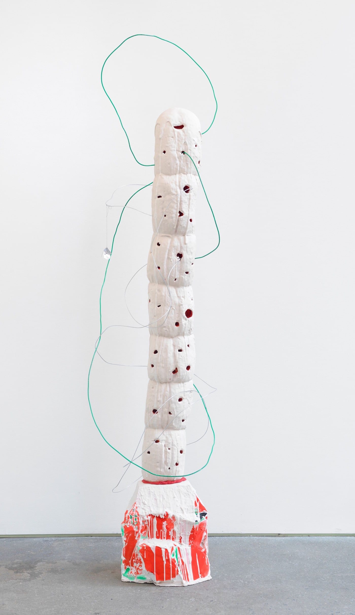 “Driftloaf Totem (Red &White)” (2017) is a modular vertical column made out of stumpy loaves of bread soaked in plaster. The column, which leans slightly, is punctuated by holes whose interiors appear to be painted red. Green wires emerge from the column only to return to it. Segre’s totem is abstract. If you are into numerology, the seven units of the column may refer to the seeker of Truth, but if Segre is thinking this, she does not take it too seriously. This is perhaps her greatest strength – she can be somber, whimsical, futuristic, and idiosyncratic, all while bringing together dubious materials. I mean, really, a sculpture made out of bread?