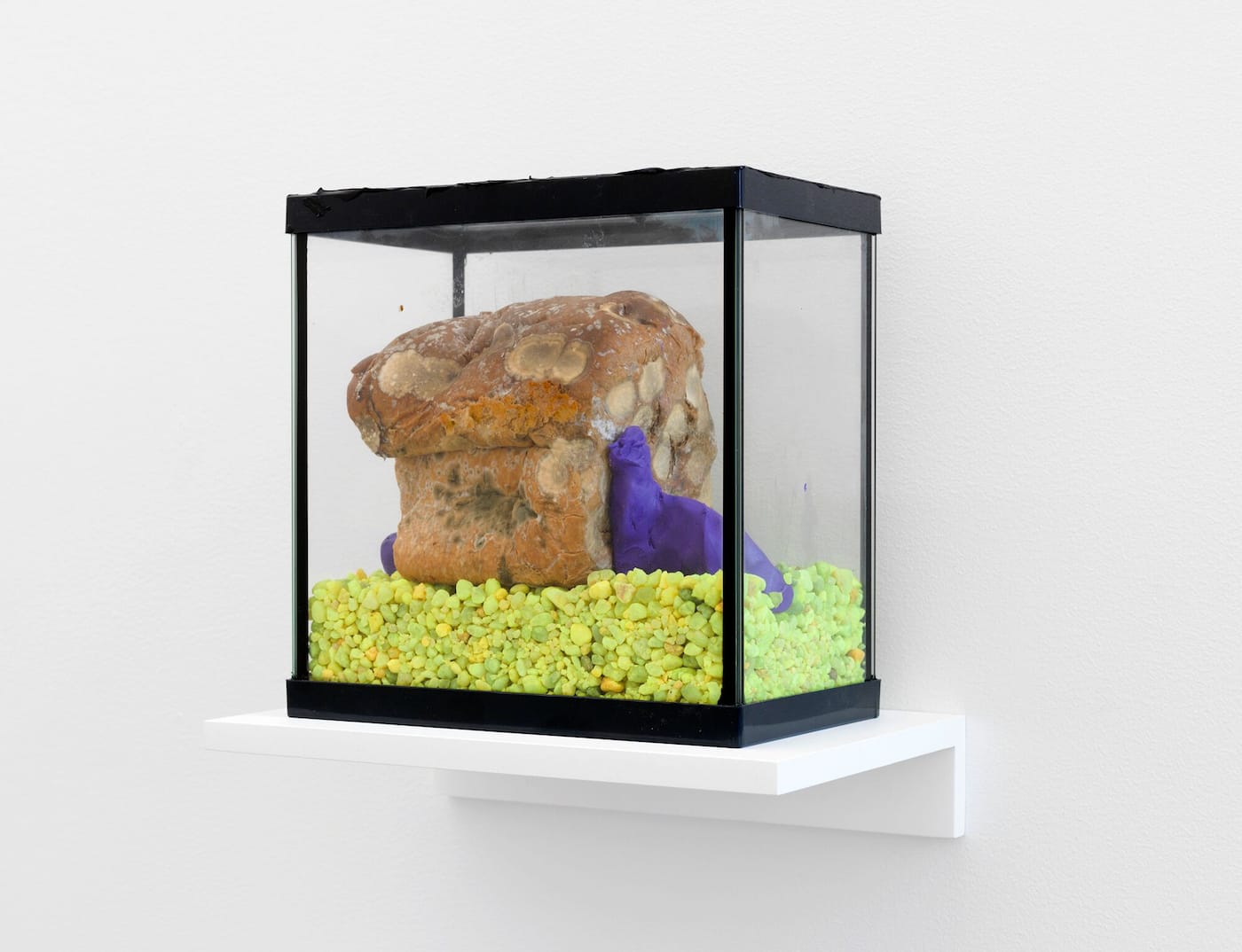 “Pet of a New Order” (2017) is a loaf of moldy bread sitting on a bed of fluorescent green pebbles inside an aquarium mounted on the wall. A piece of purple plasticine, like a tail, seems to be growing out of one end of the bread’s torso, with a purple form on the other side that becomes a kind of neck (or are they weird bookends?). Its skin is infected with spores. During the Middle Ages, poisoning caused by consuming rye bread made from ergot-infected grain was common. Ergot poisoning causes individuals to hallucinate and go beserk; it contains lysergic acid, a key component for synthesis of the hallucinogen LSD. Another one of ergotism’s effects is gangrene, the loss of one’s limbs.